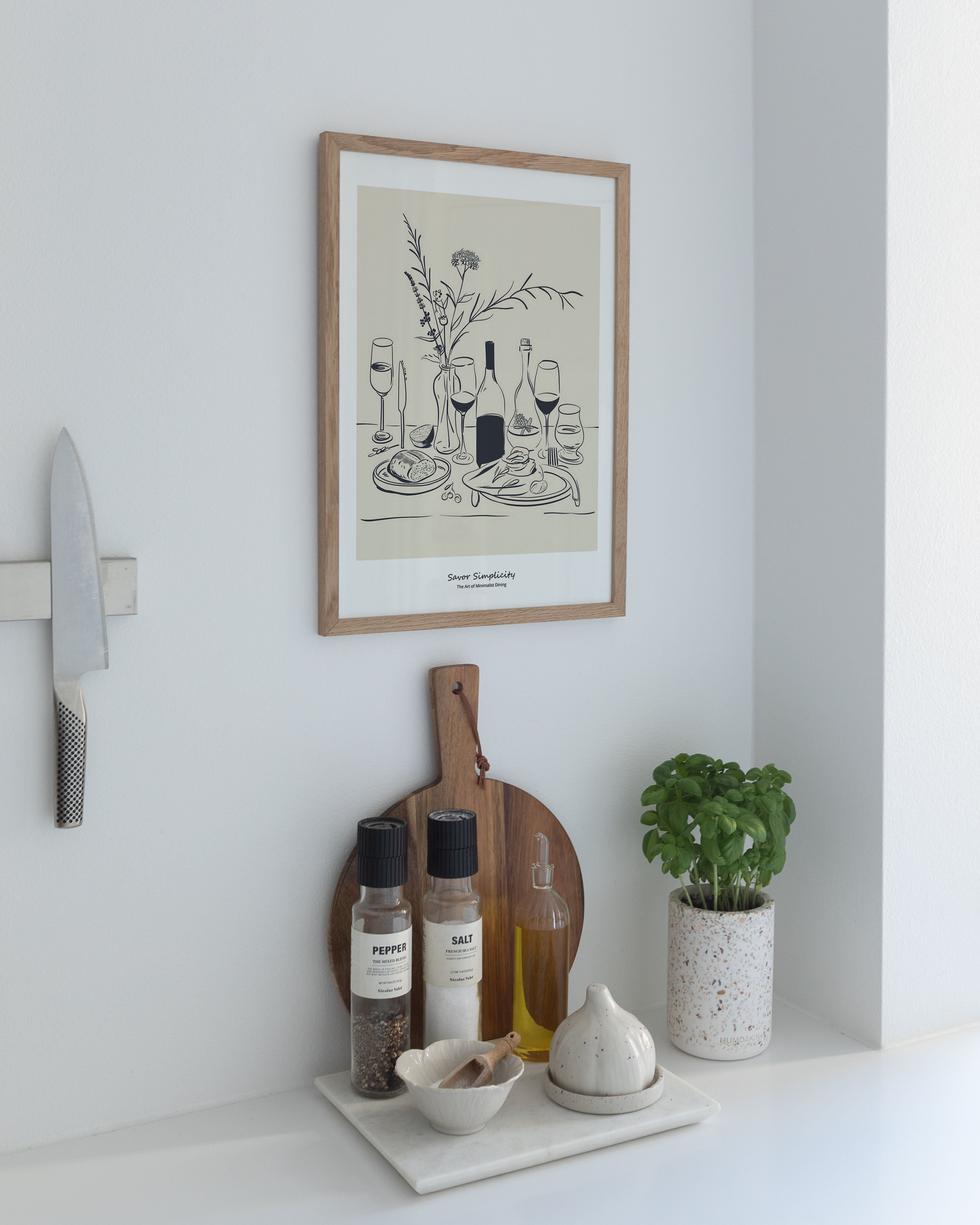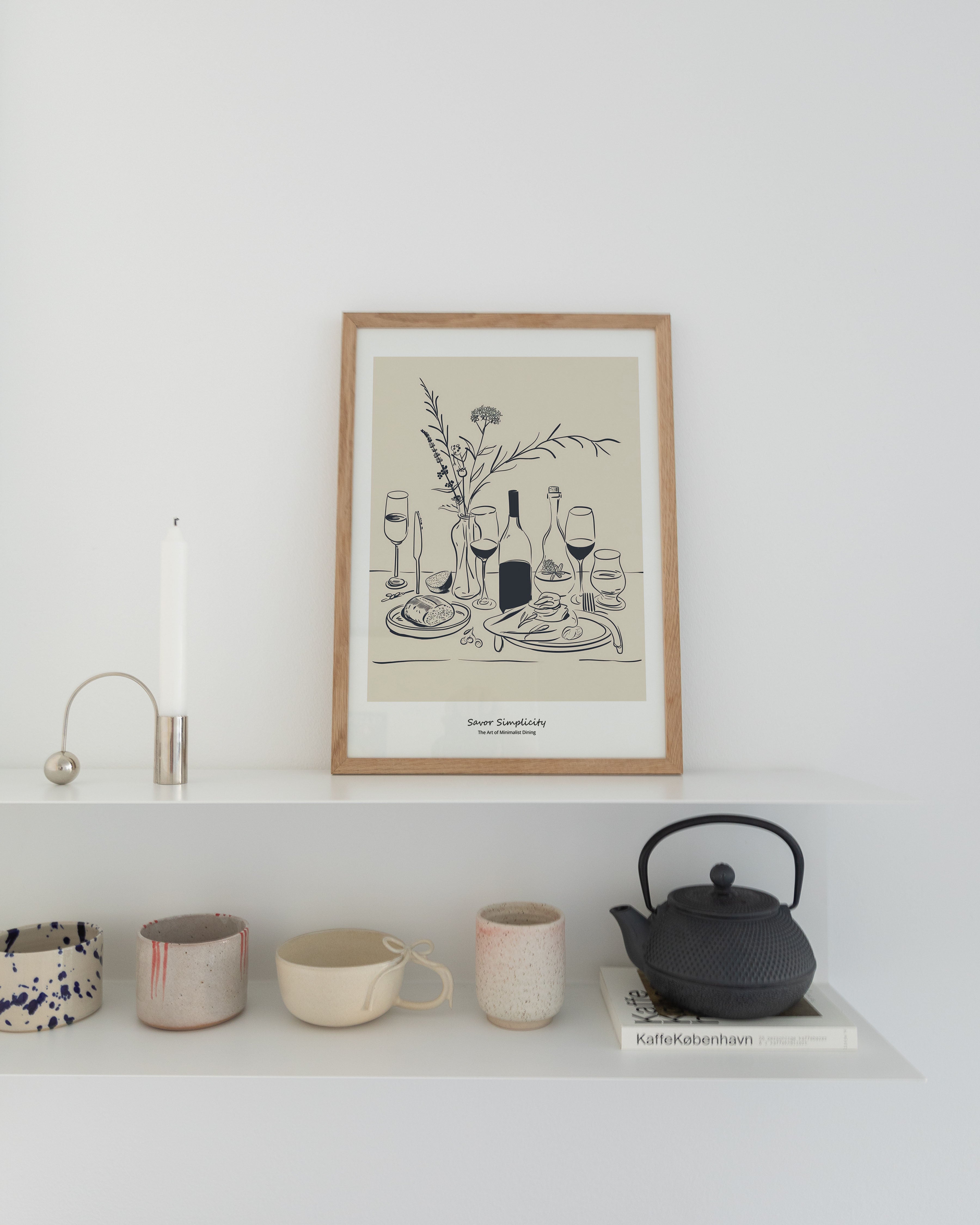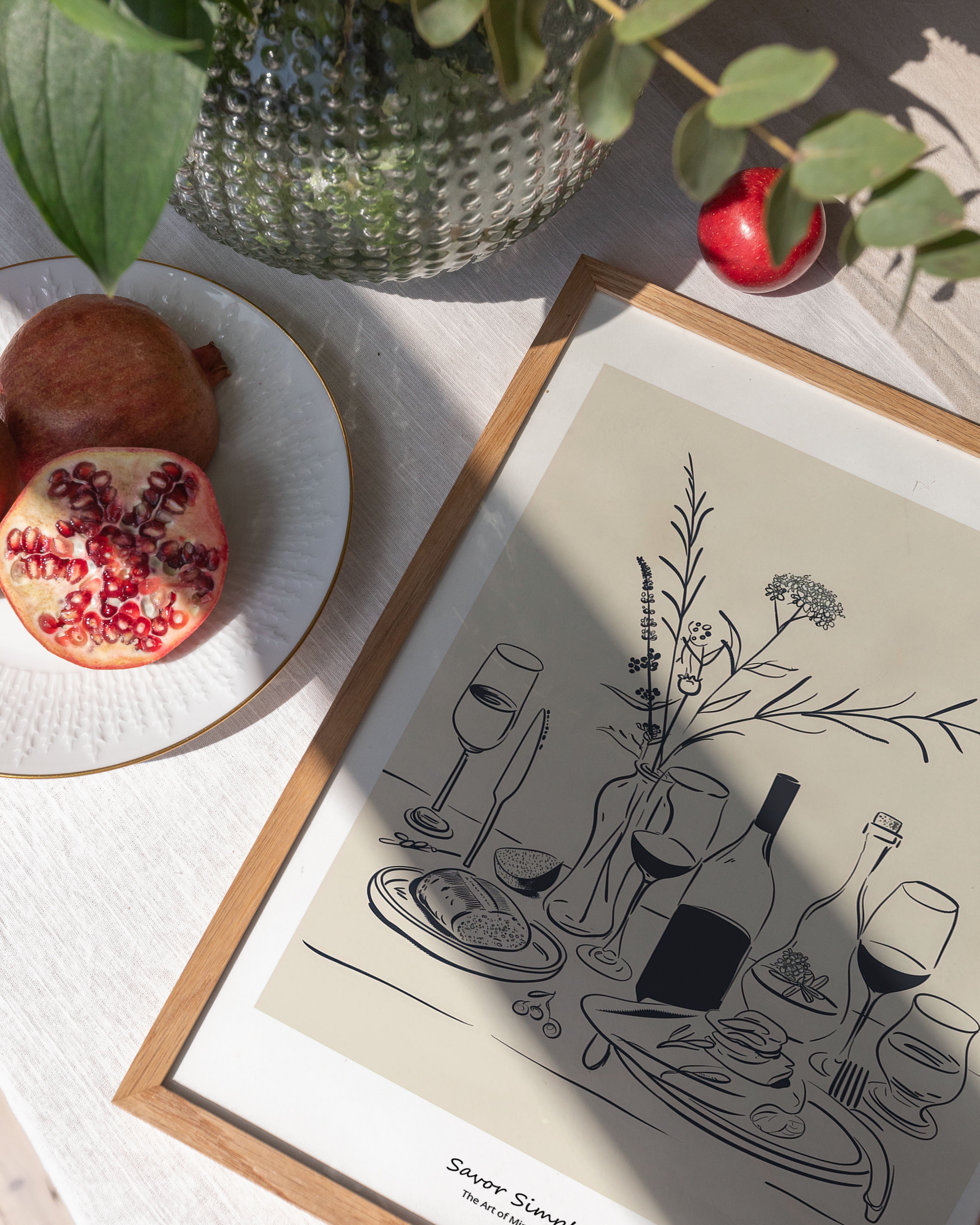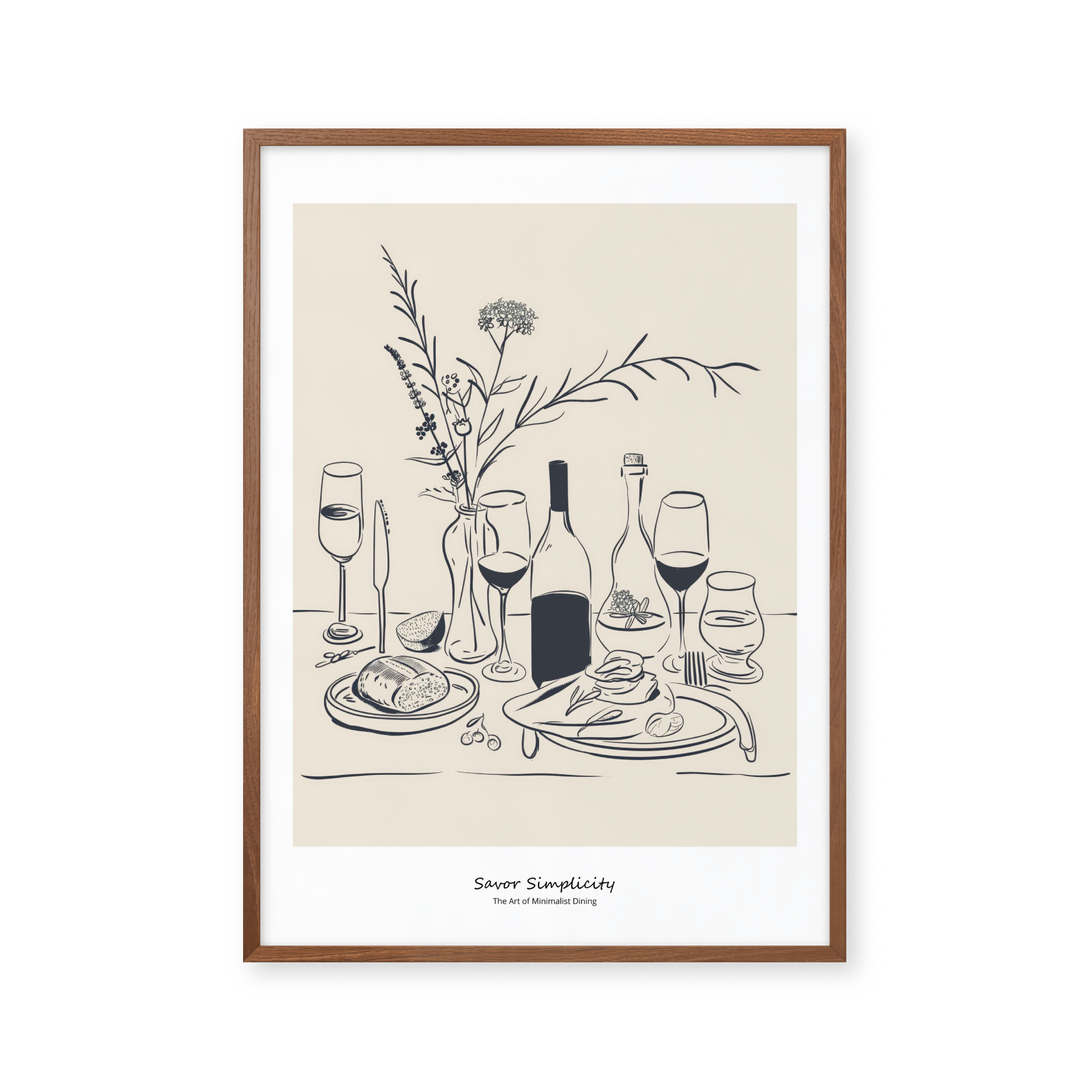 Opdag "Savor Simplicity" - en elegant plakat, der fejrer minimalistisk spisning. Med en beroligende palet af bløde beige og kontrasterende blå nuancer, skildrer denne kunstneriske fremstilling et stilfuldt dækket bord, der indbyder til ro og nydelse. Perfekt til at tilføre et touch af underspillet elegance til ethvert rum.