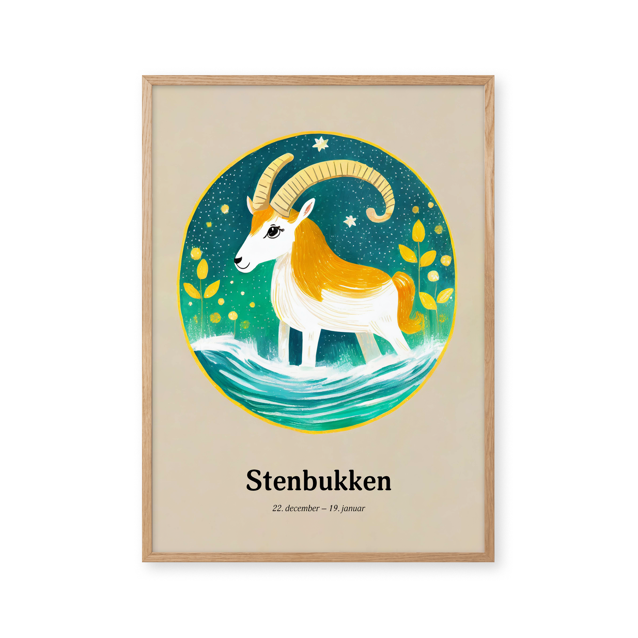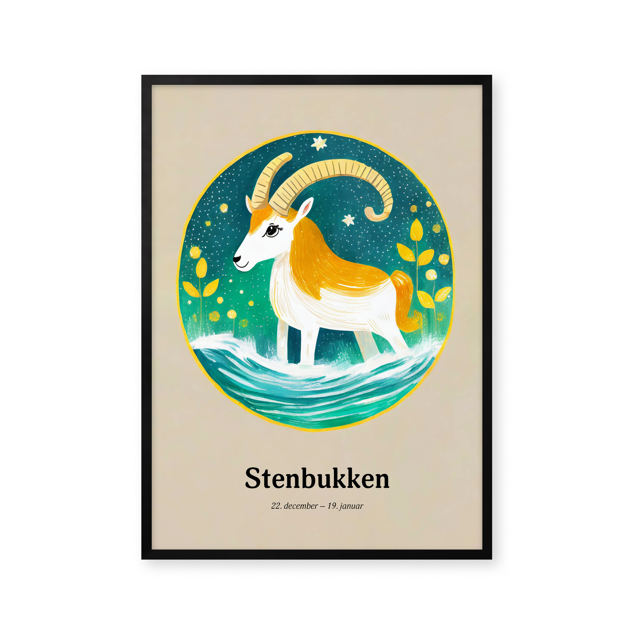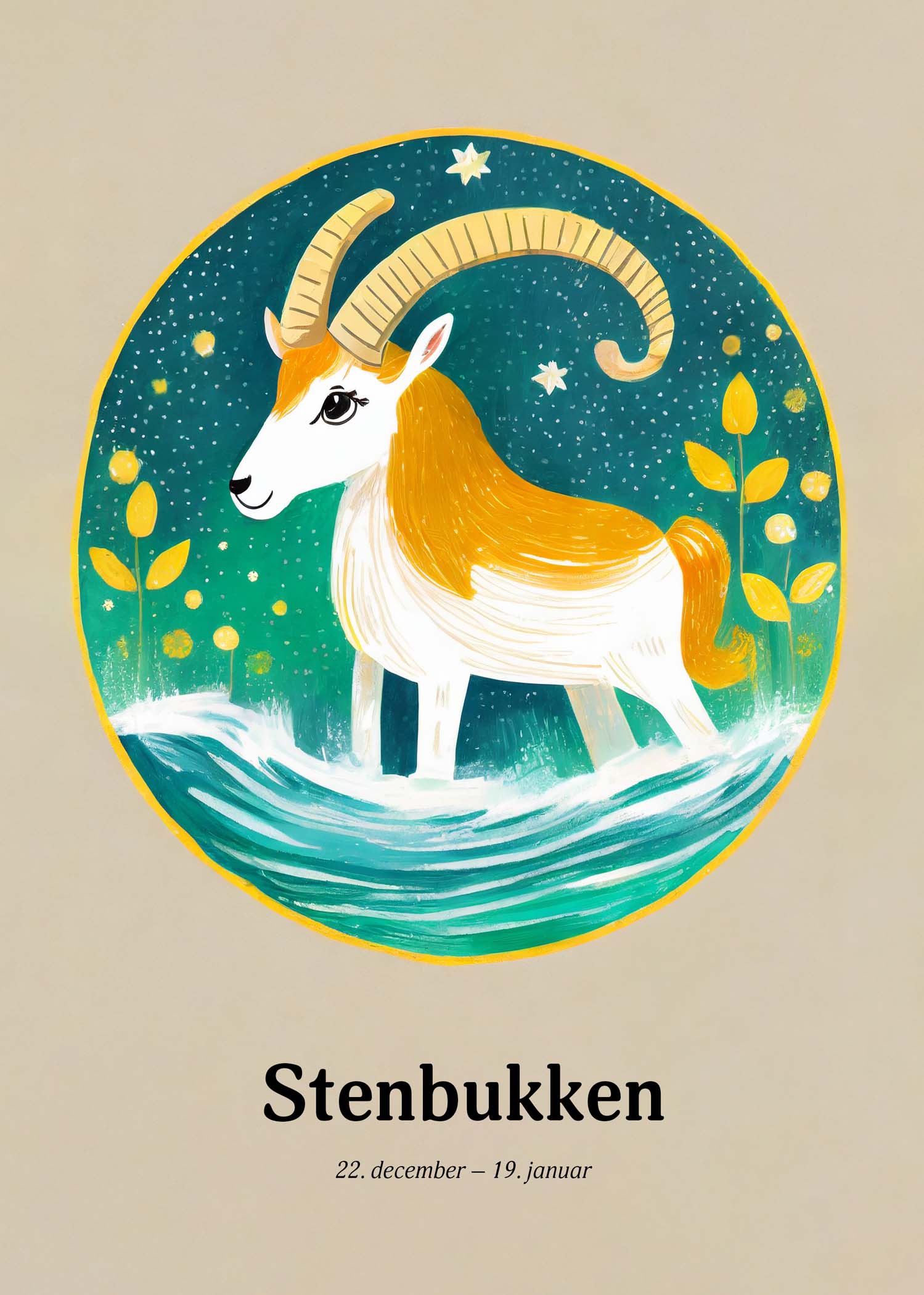 "Opdag "Stenbukkens Stjernetegn" plakat, en himmelsk harmoni af gyldne nuancer og azurblåt vand. Denne kunstneriske fortolkning fanger stenbukkens standhaftige ånd med livlige farver og stjernespækket design, perfekt til at tilføre et strejf af kosmisk elegance til ethvert rum."