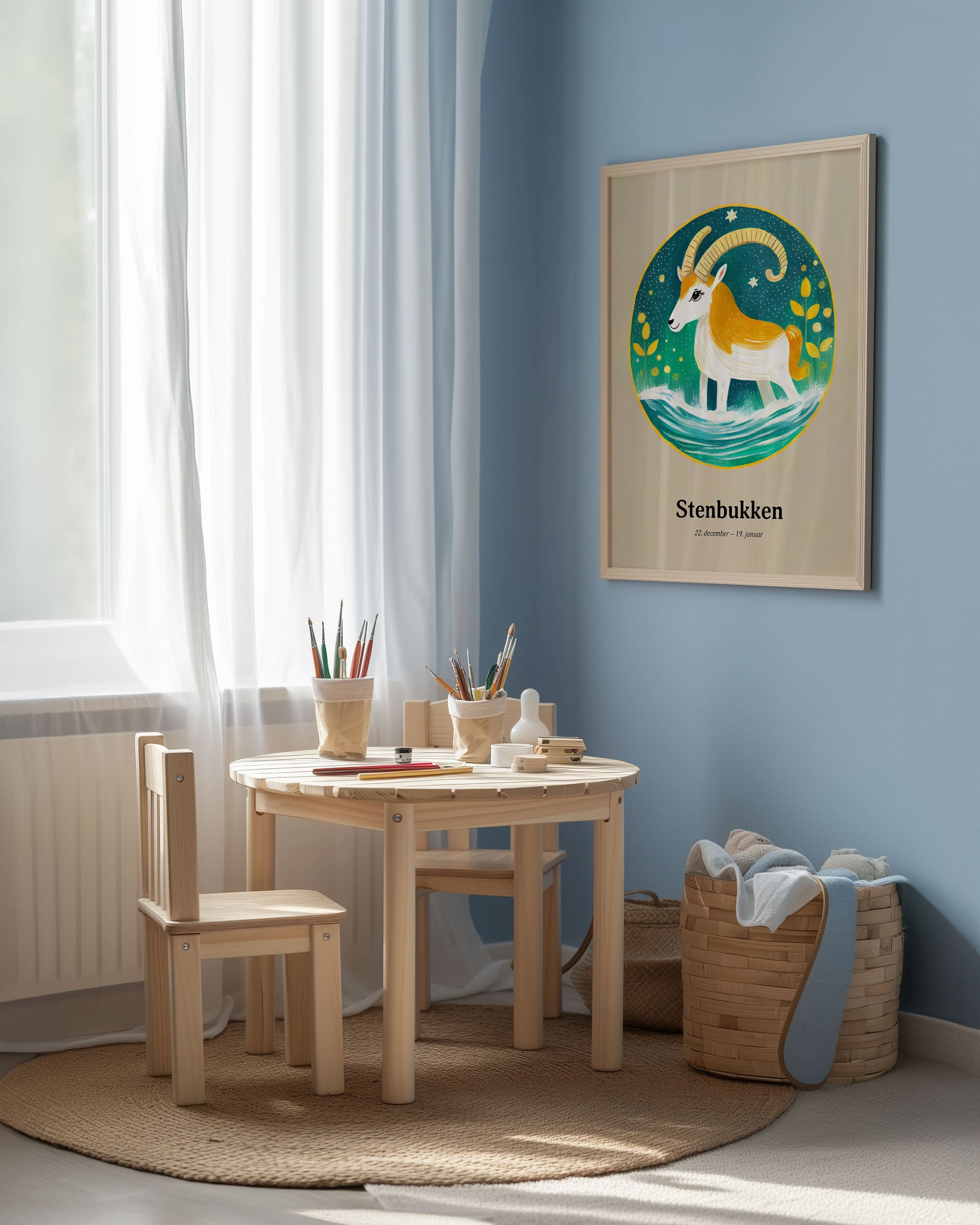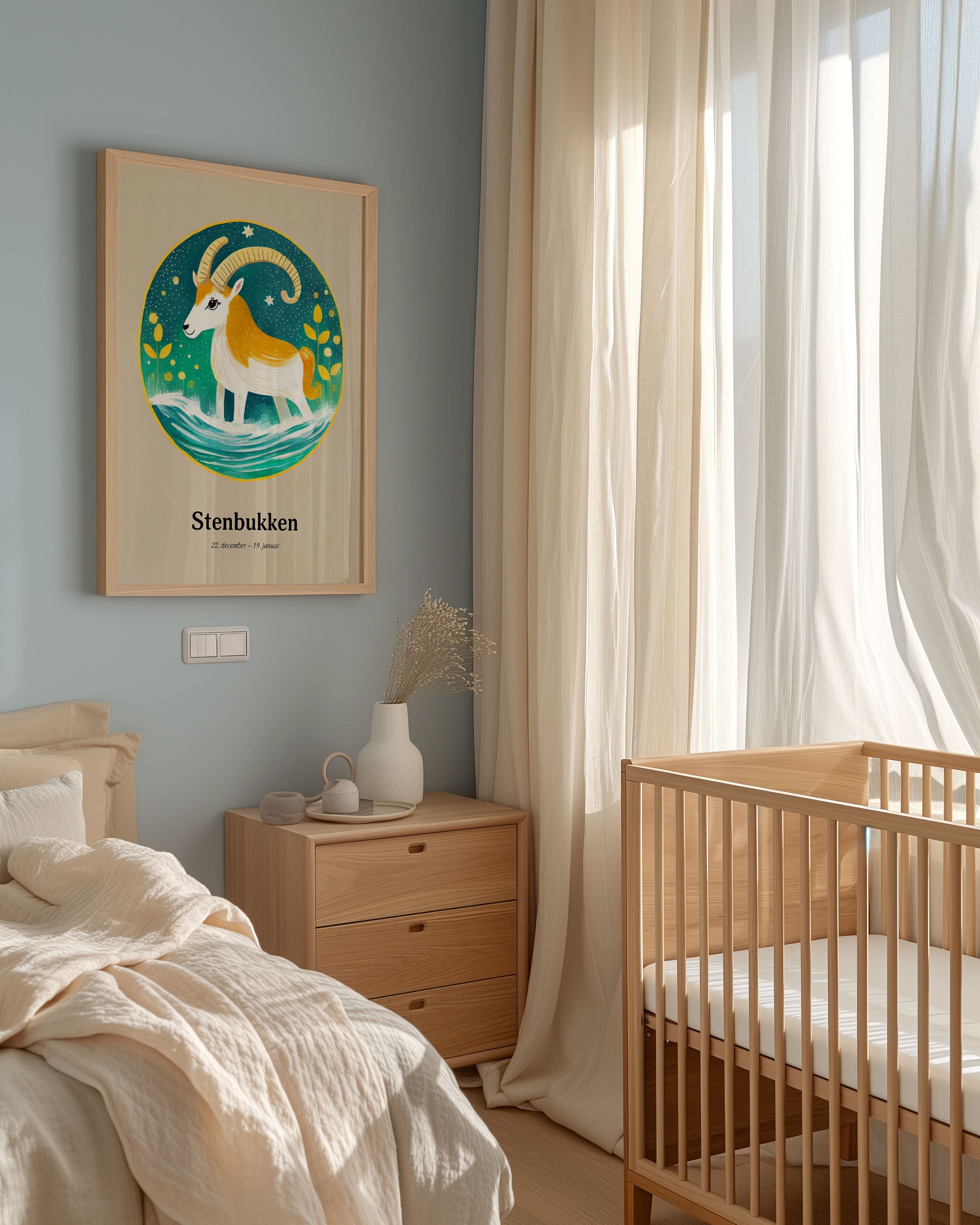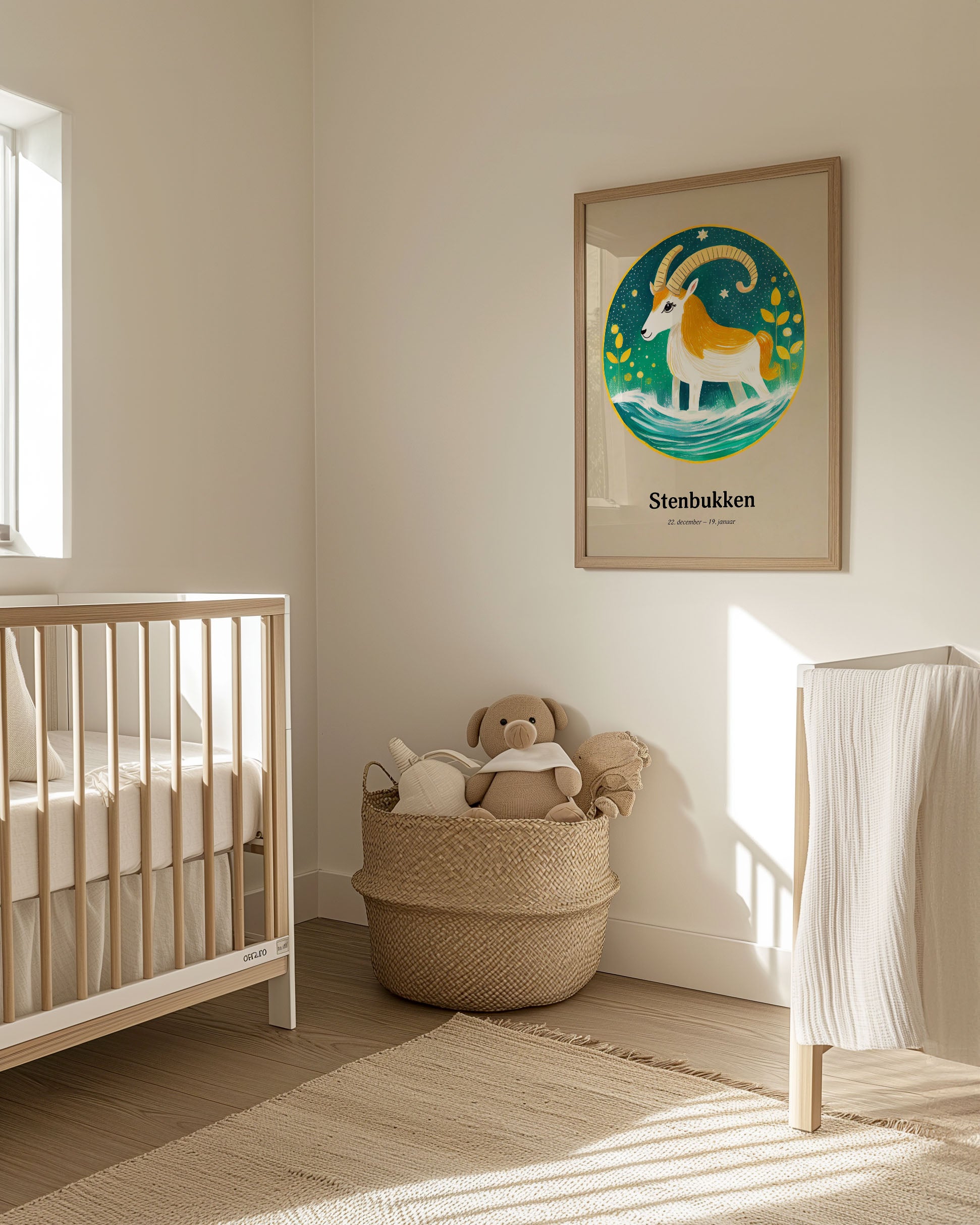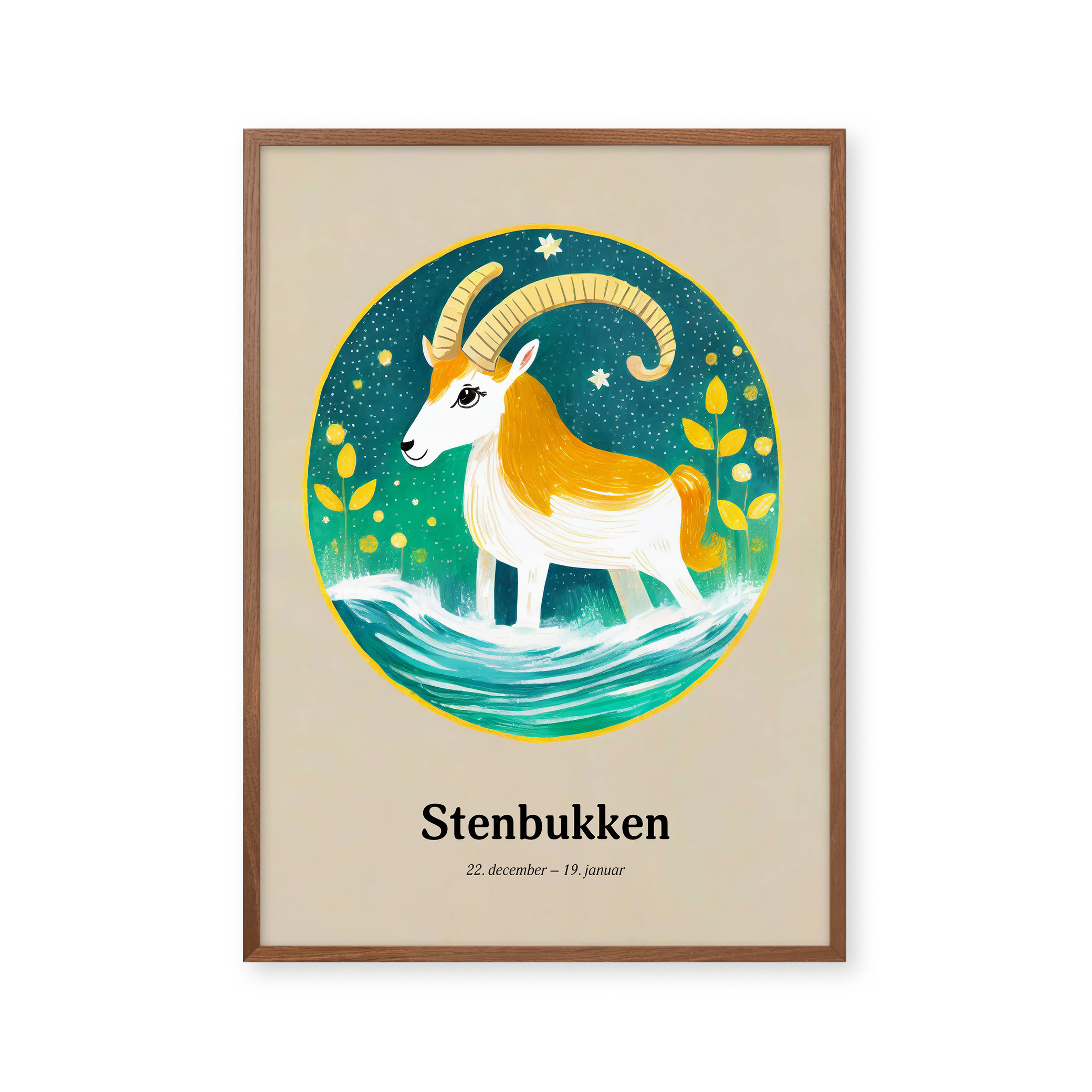 "Opdag "Stenbukkens Stjernetegn" plakat, en himmelsk harmoni af gyldne nuancer og azurblåt vand. Denne kunstneriske fortolkning fanger stenbukkens standhaftige ånd med livlige farver og stjernespækket design, perfekt til at tilføre et strejf af kosmisk elegance til ethvert rum."