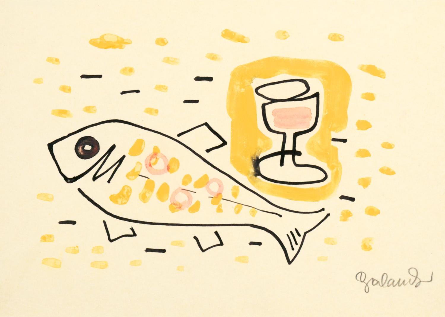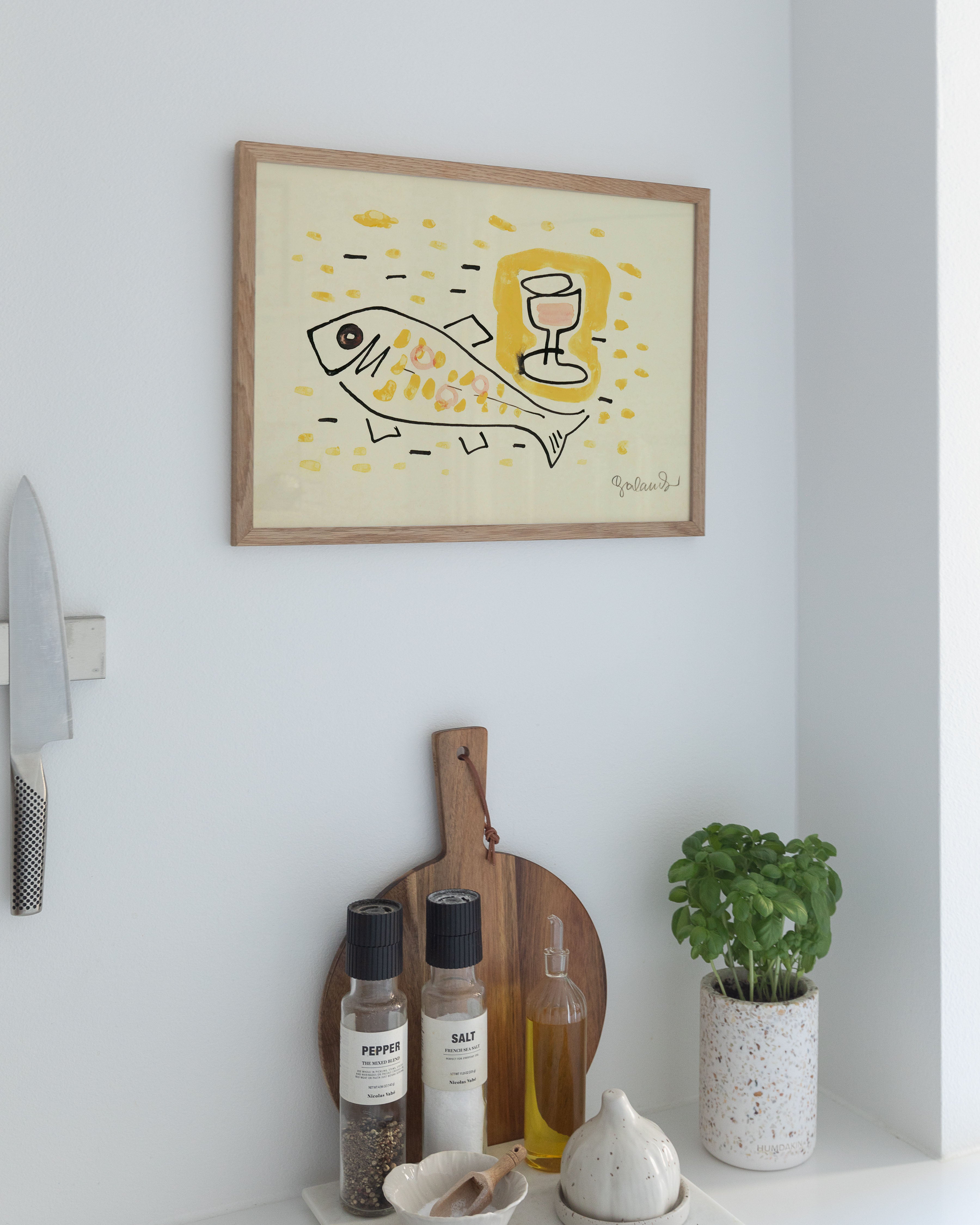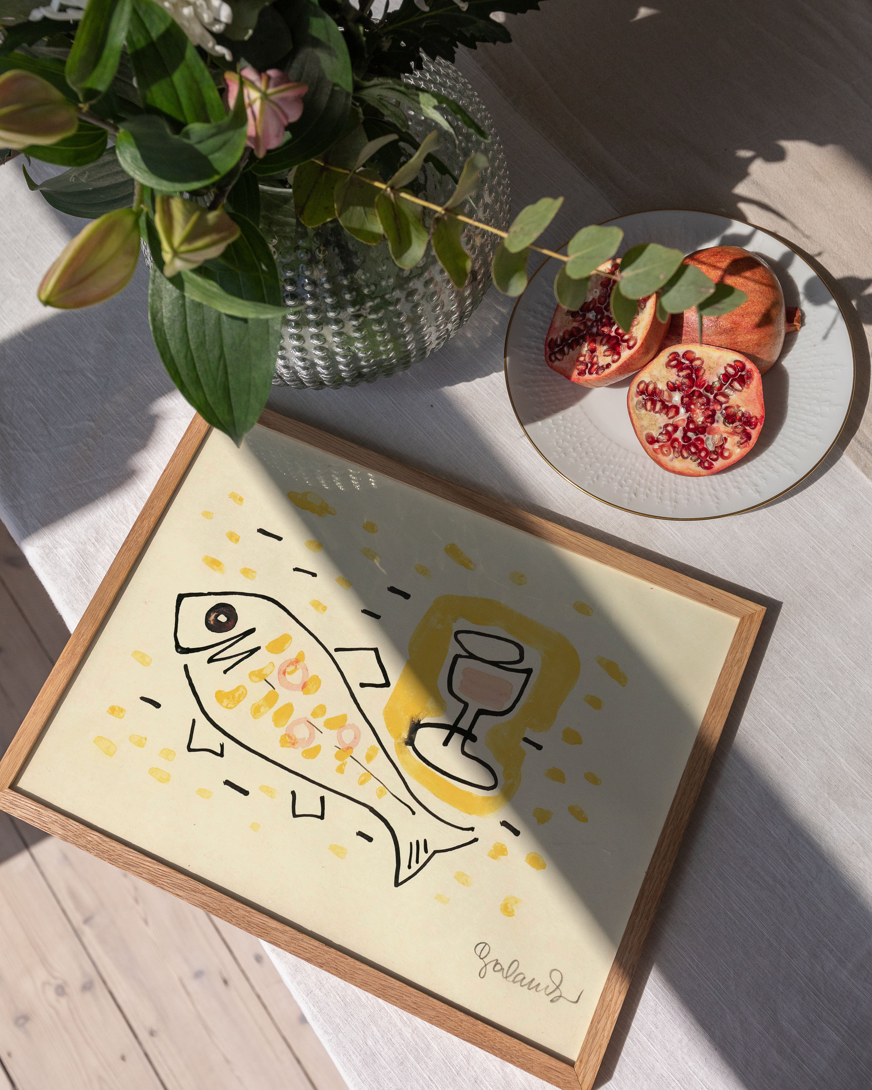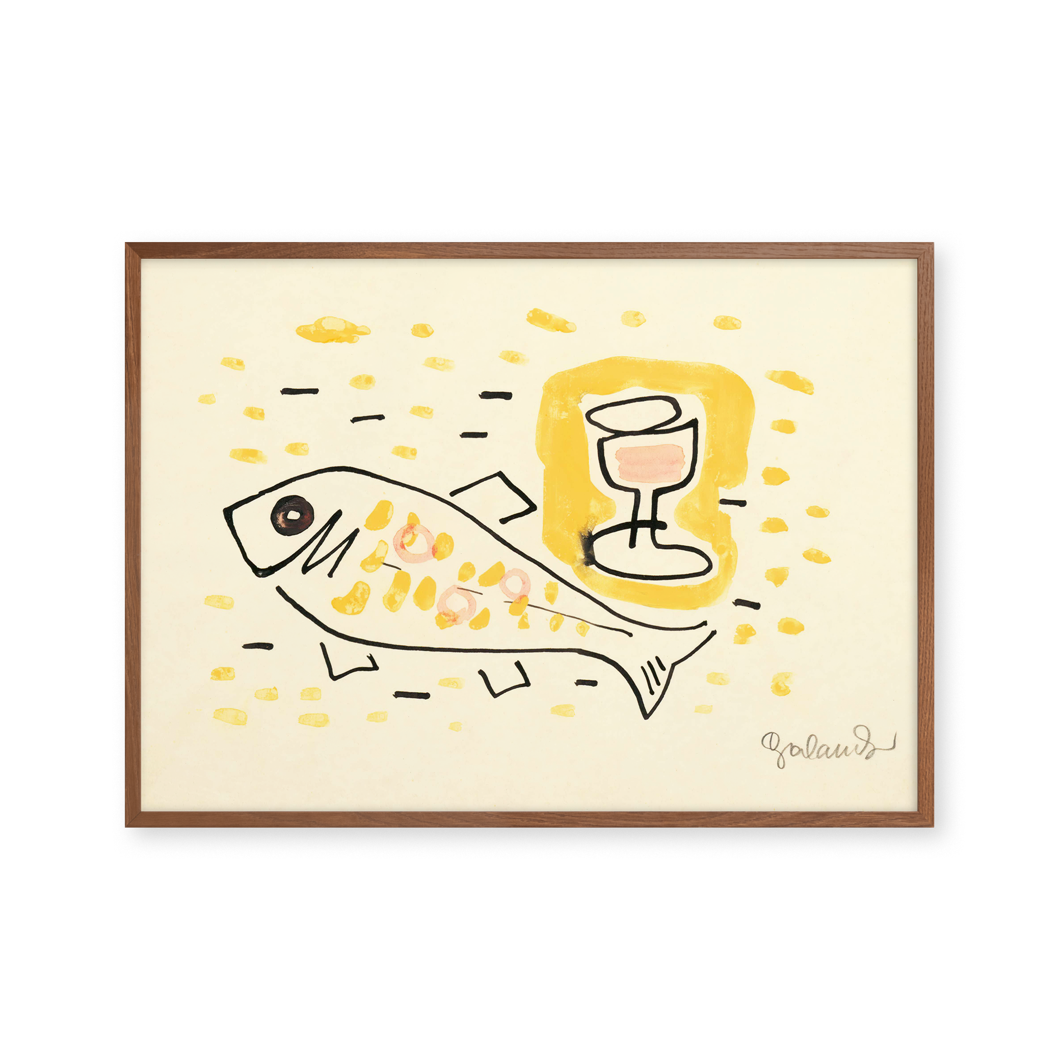 "Still life with fish" - En livlig plakat med en farverig fisk og et glas, der fanger øjet med sine varme gule og orange nuancer. Perfekt til at tilføje et unikt og kunstnerisk touch til ethvert rum. Ideel til kunstelskere og dem, der søger noget særligt.