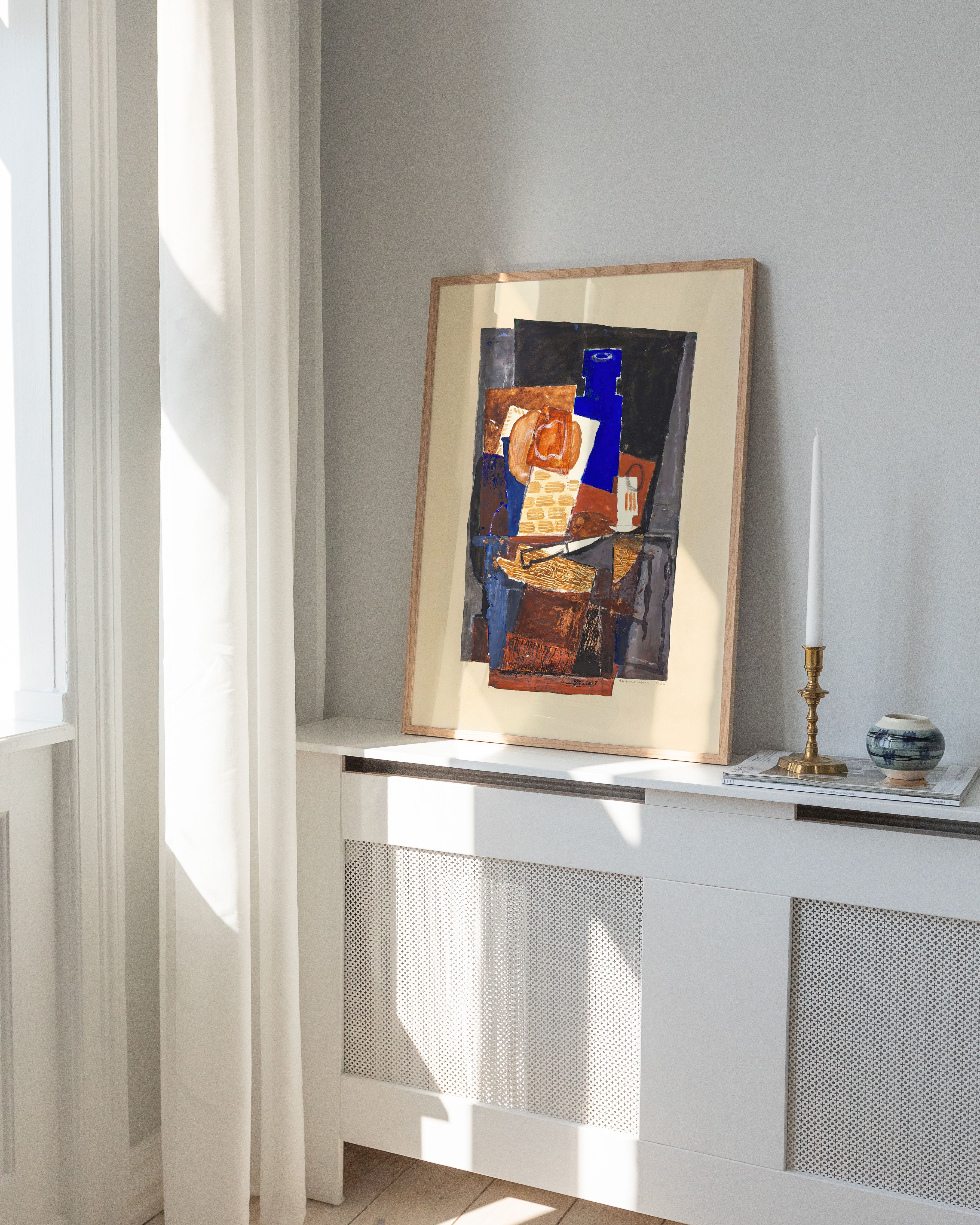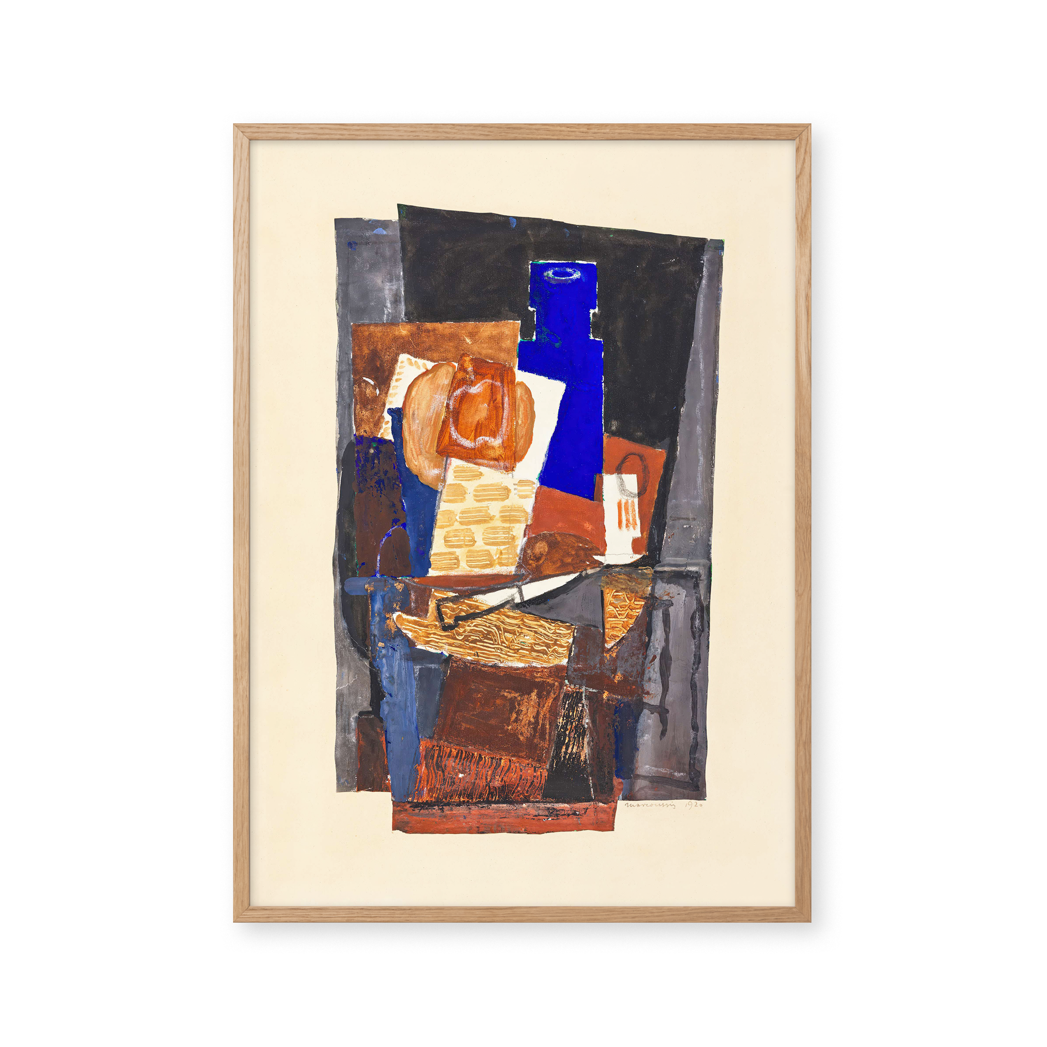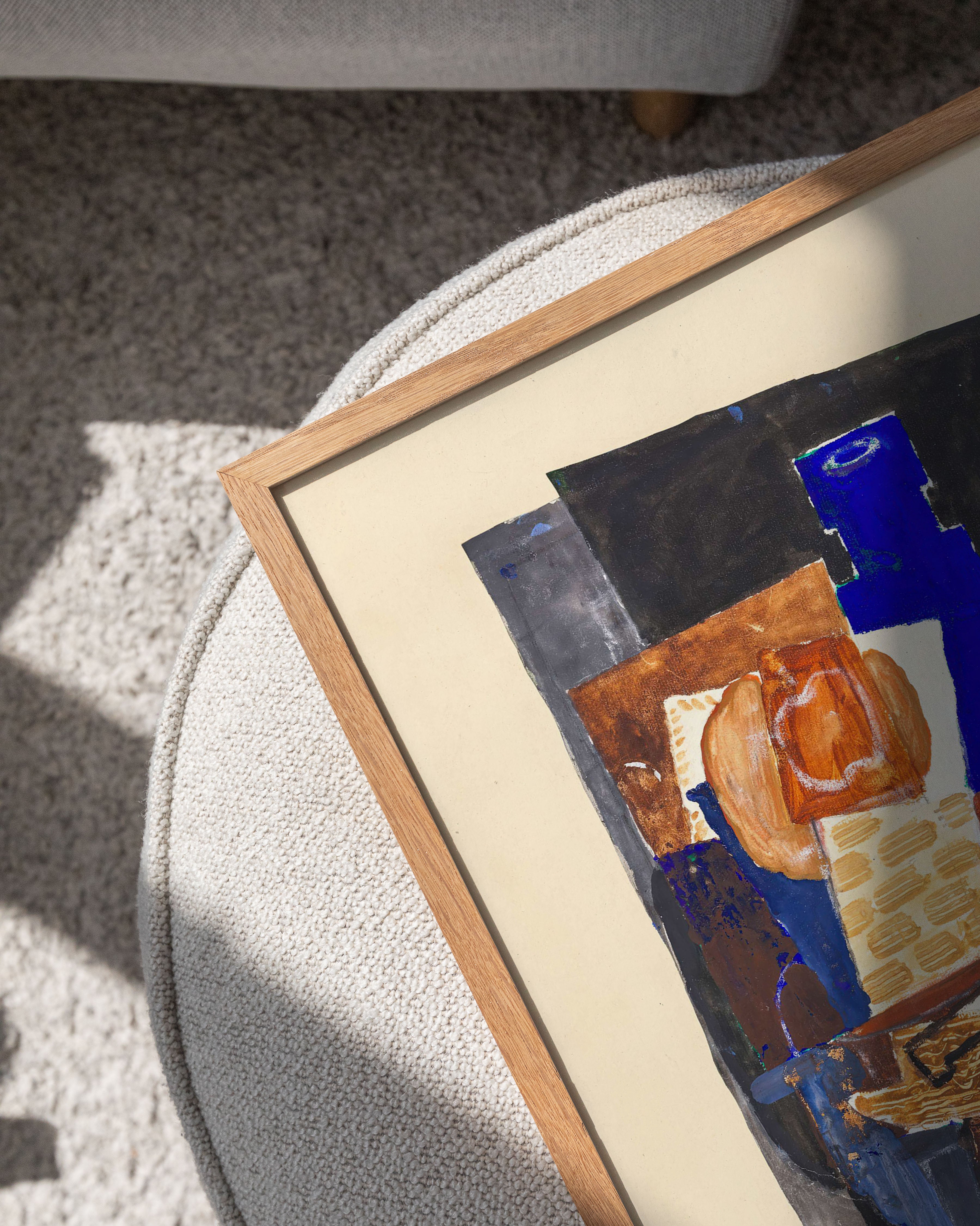 "Still Life with Knife" - En farverig plakat, der kombinerer dybe blå og varme jordfarver i et unikt kubistisk design. Perfekt til at tilføje et kunstnerisk touch til ethvert rum. Oplev en fascinerende blanding af former og teksturer, der fanger øjet og inspirerer.