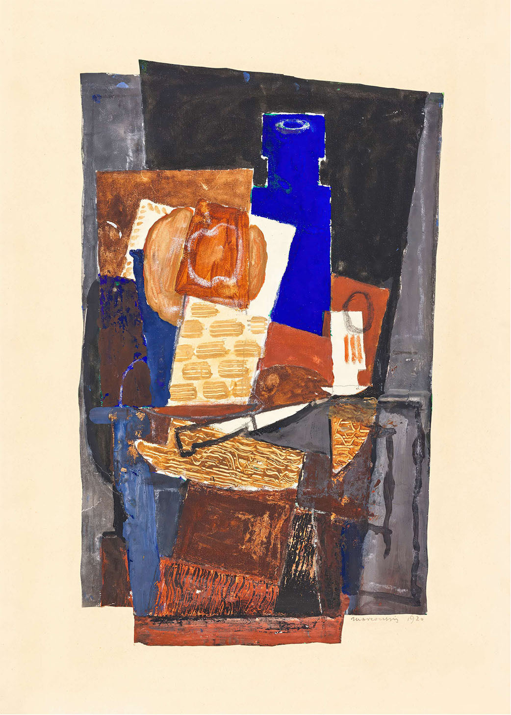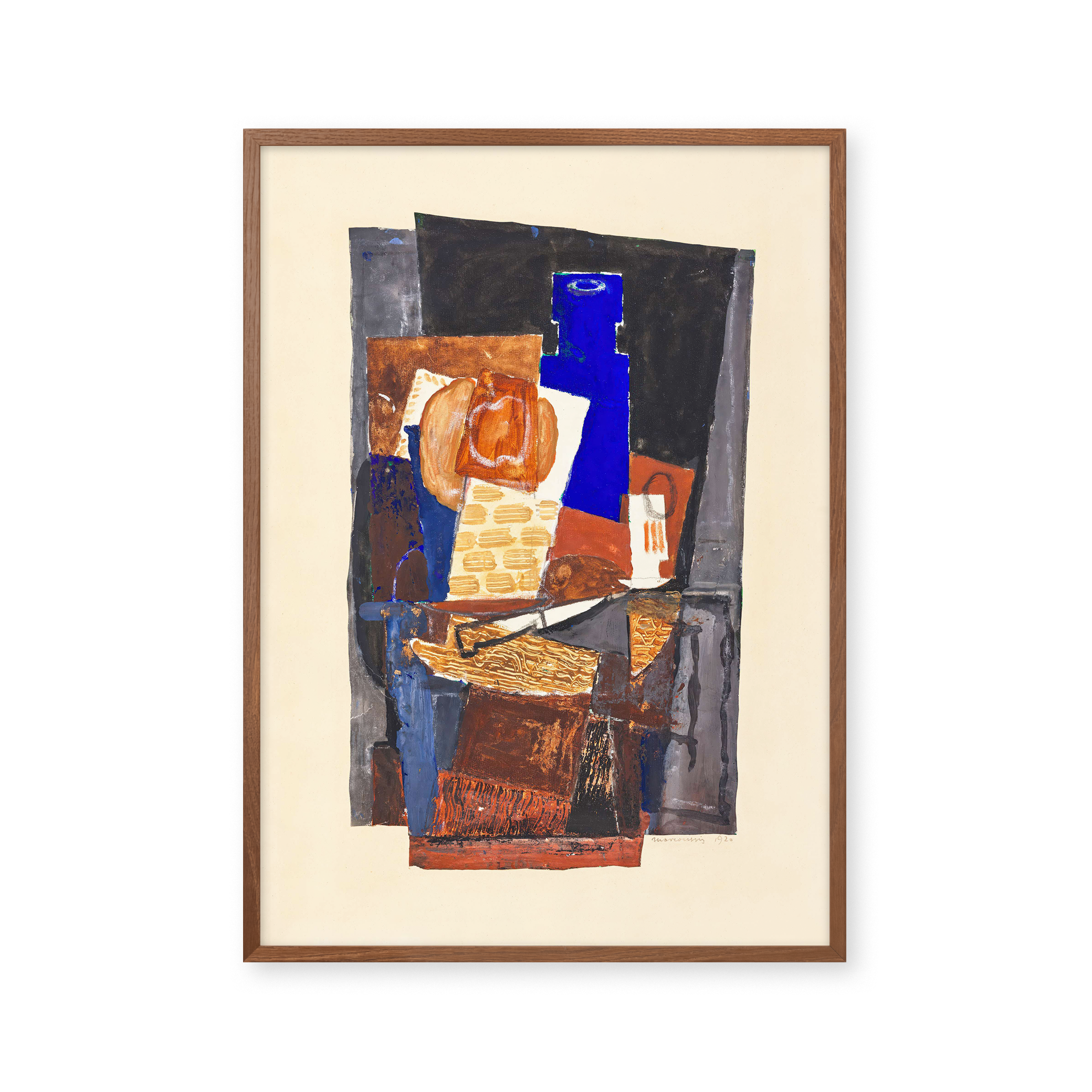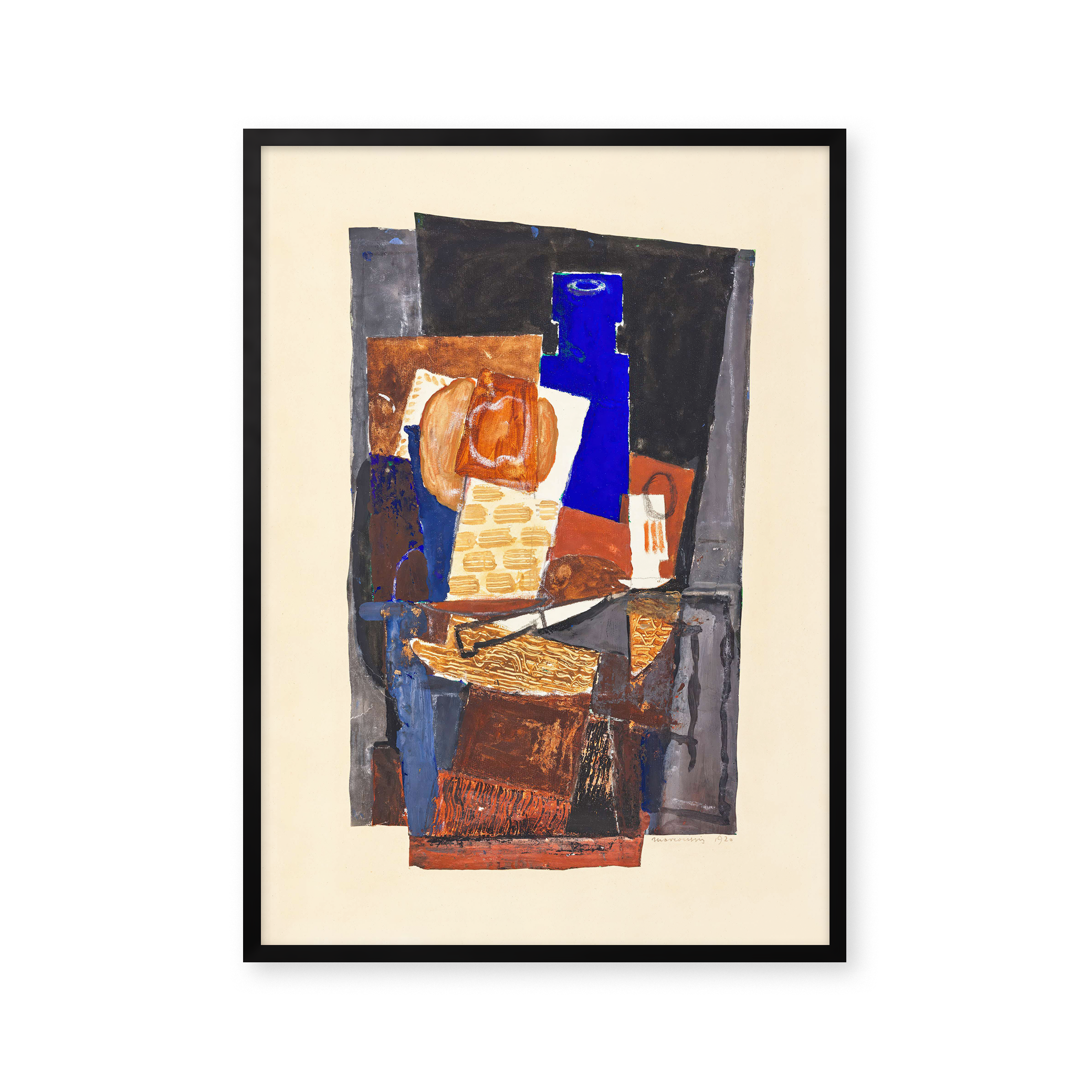 "Still Life with Knife" - En farverig plakat, der kombinerer dybe blå og varme jordfarver i et unikt kubistisk design. Perfekt til at tilføje et kunstnerisk touch til ethvert rum. Oplev en fascinerende blanding af former og teksturer, der fanger øjet og inspirerer.
