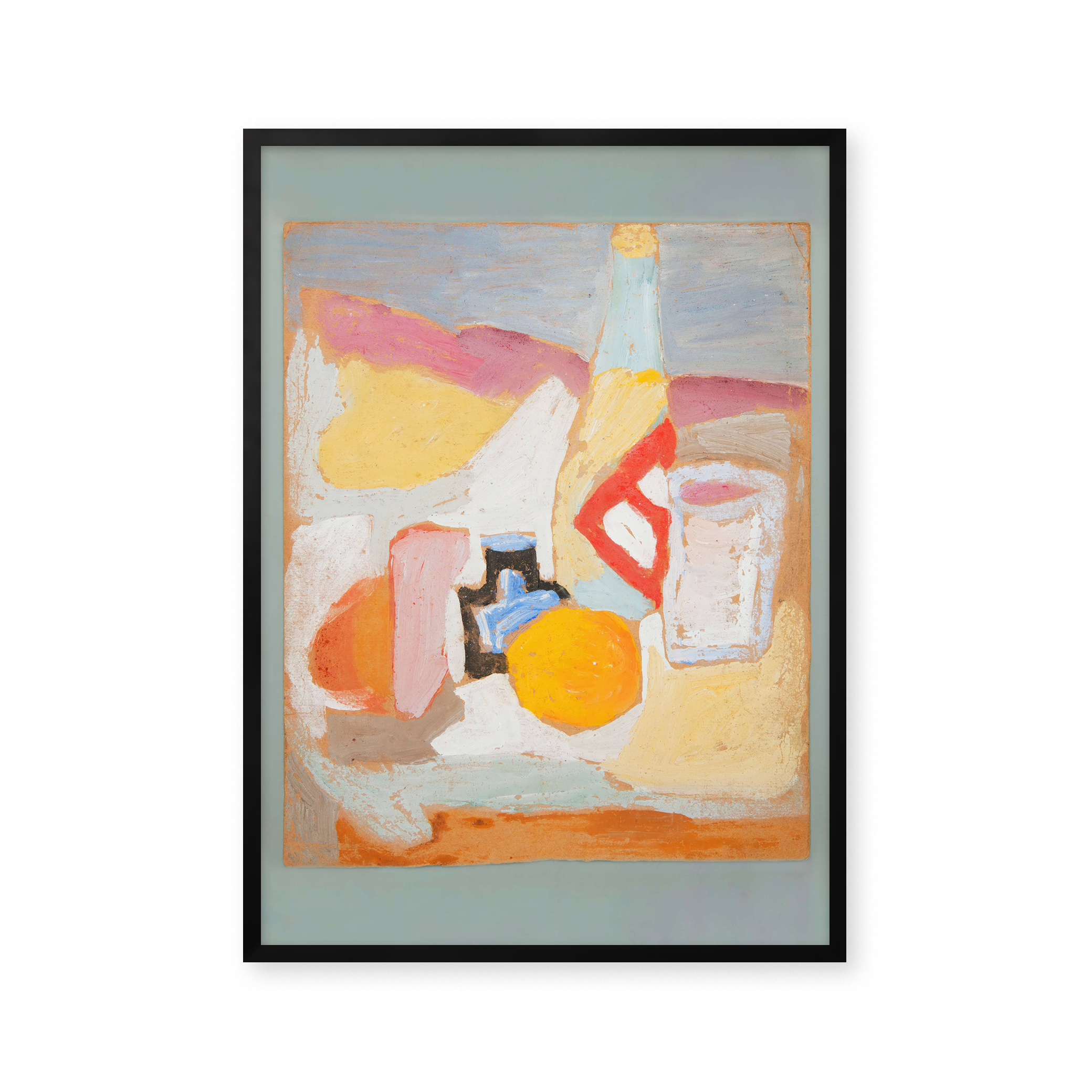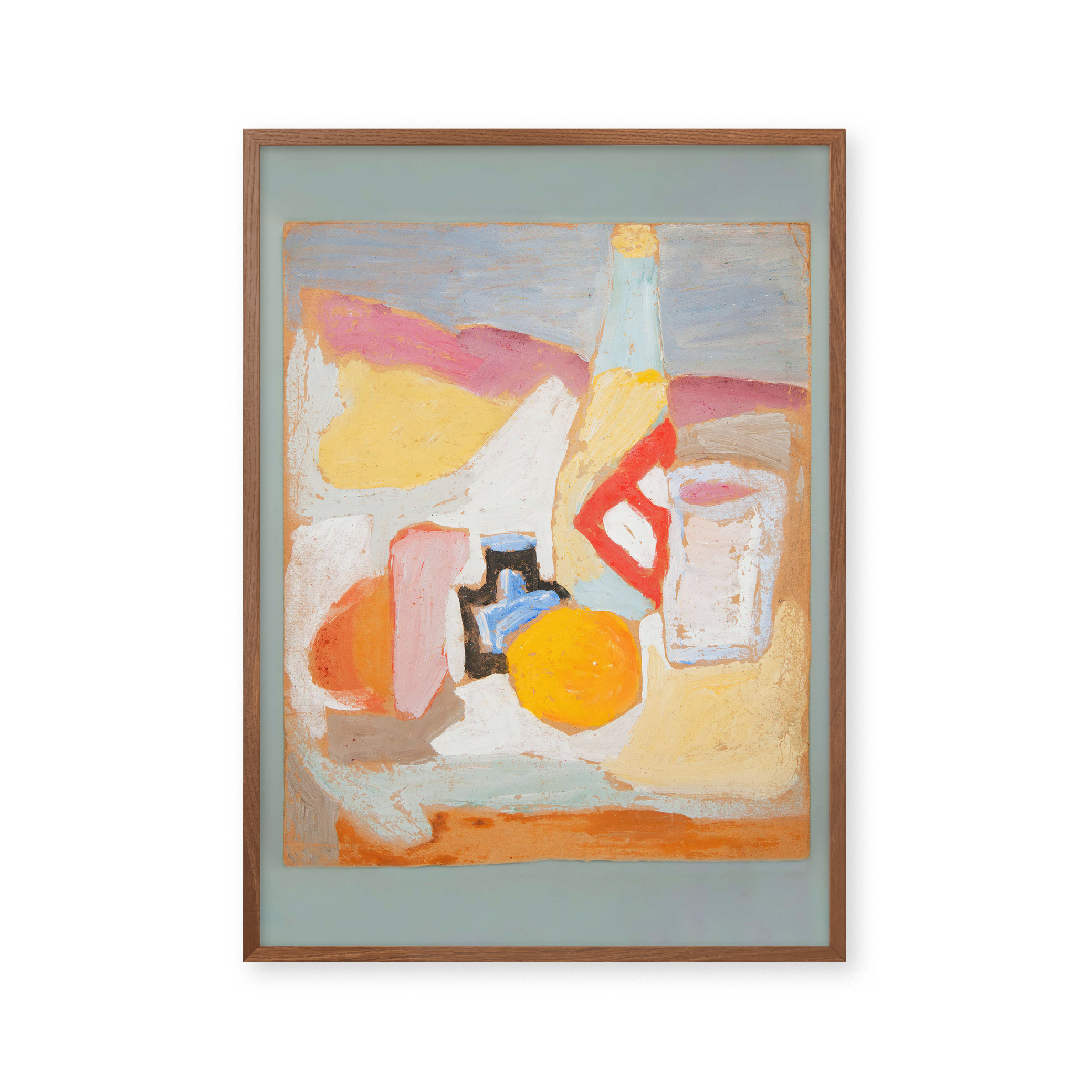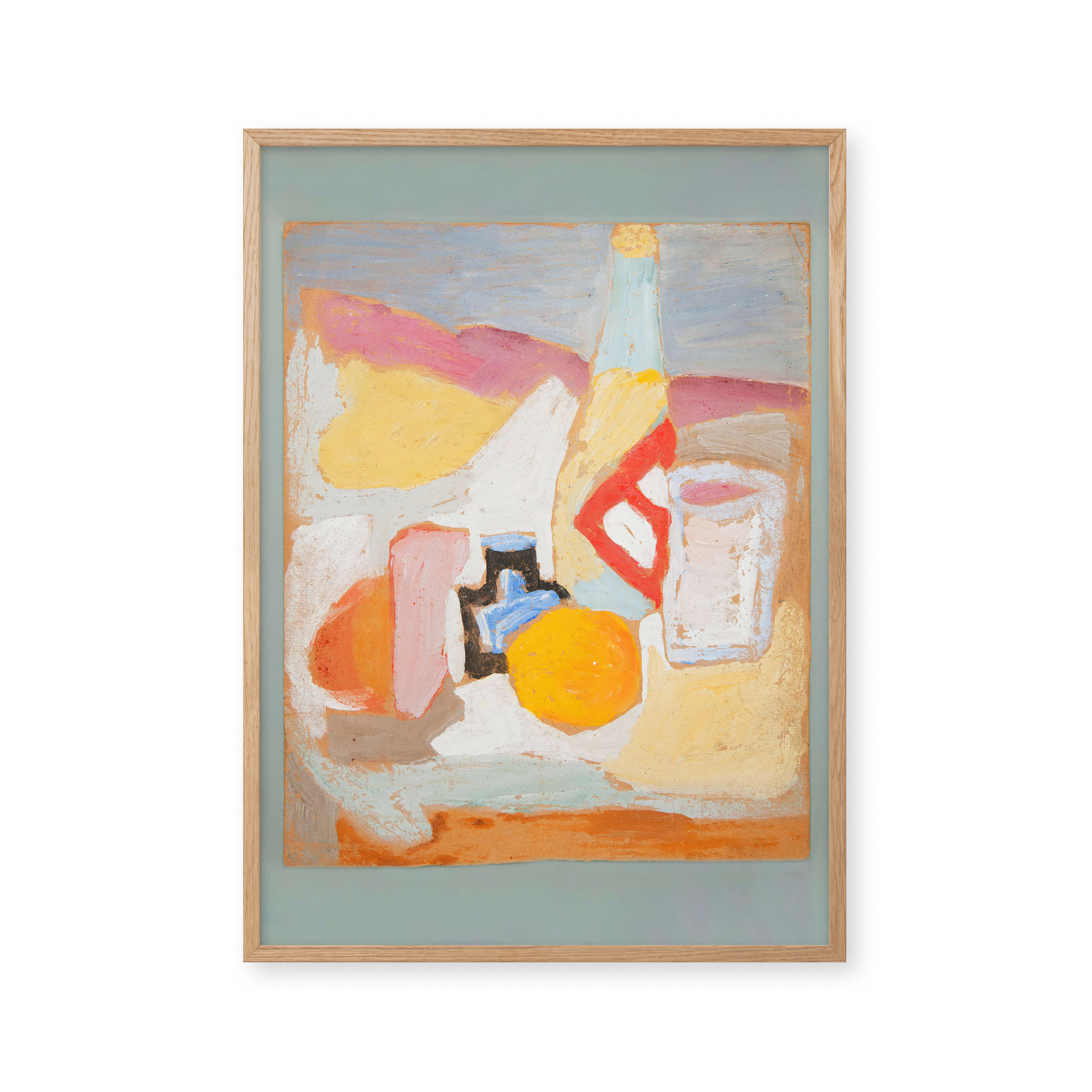 "Still life with orange, bottle and inkwell" - Oplev en farverig og unik plakat, der fanger essensen af stillebenkunst. Med levende nuancer af orange, blå og rosa, bringer denne plakat liv til ethvert rum. Perfekt til kunstelskere, der søger noget særligt og iøjnefaldende.