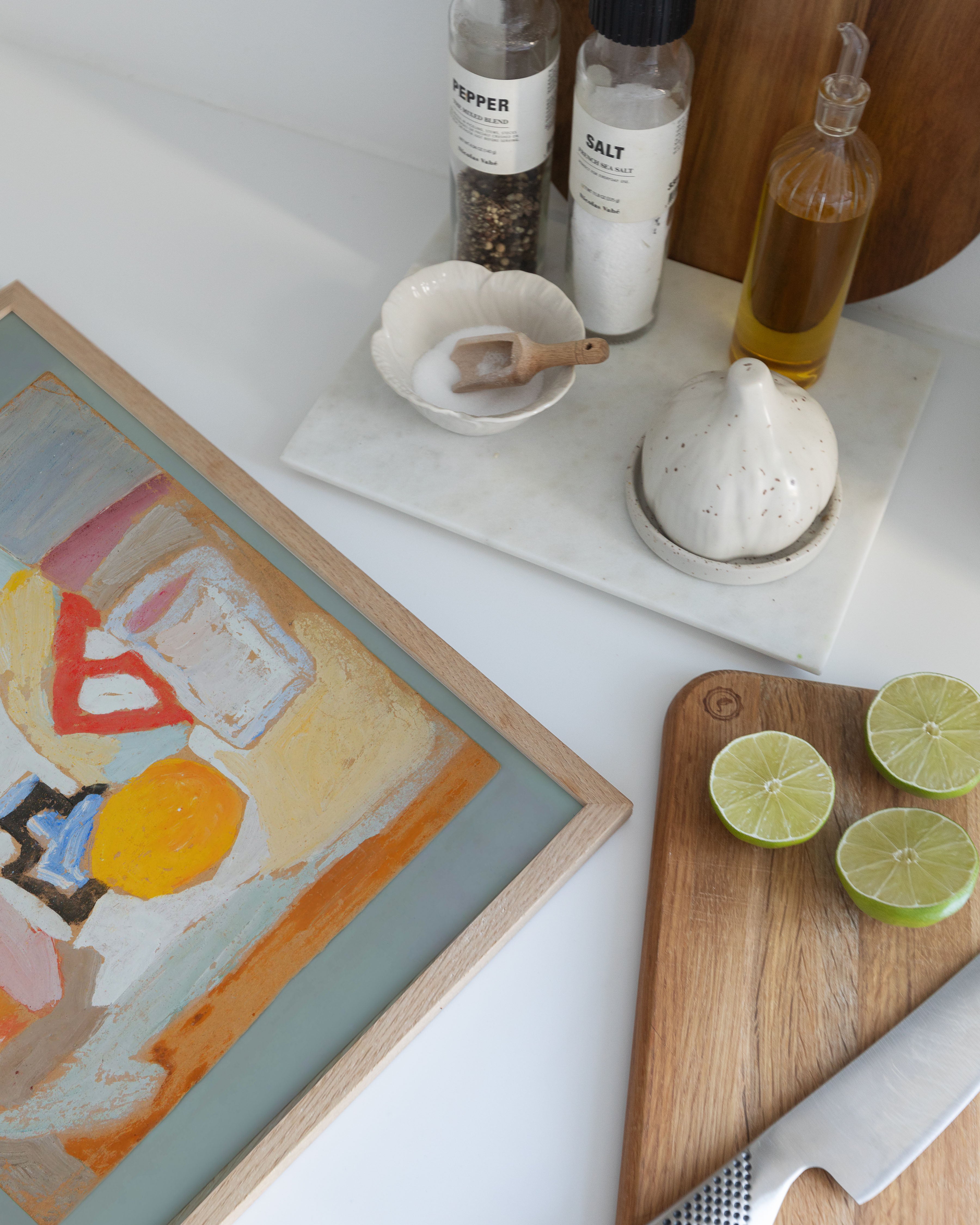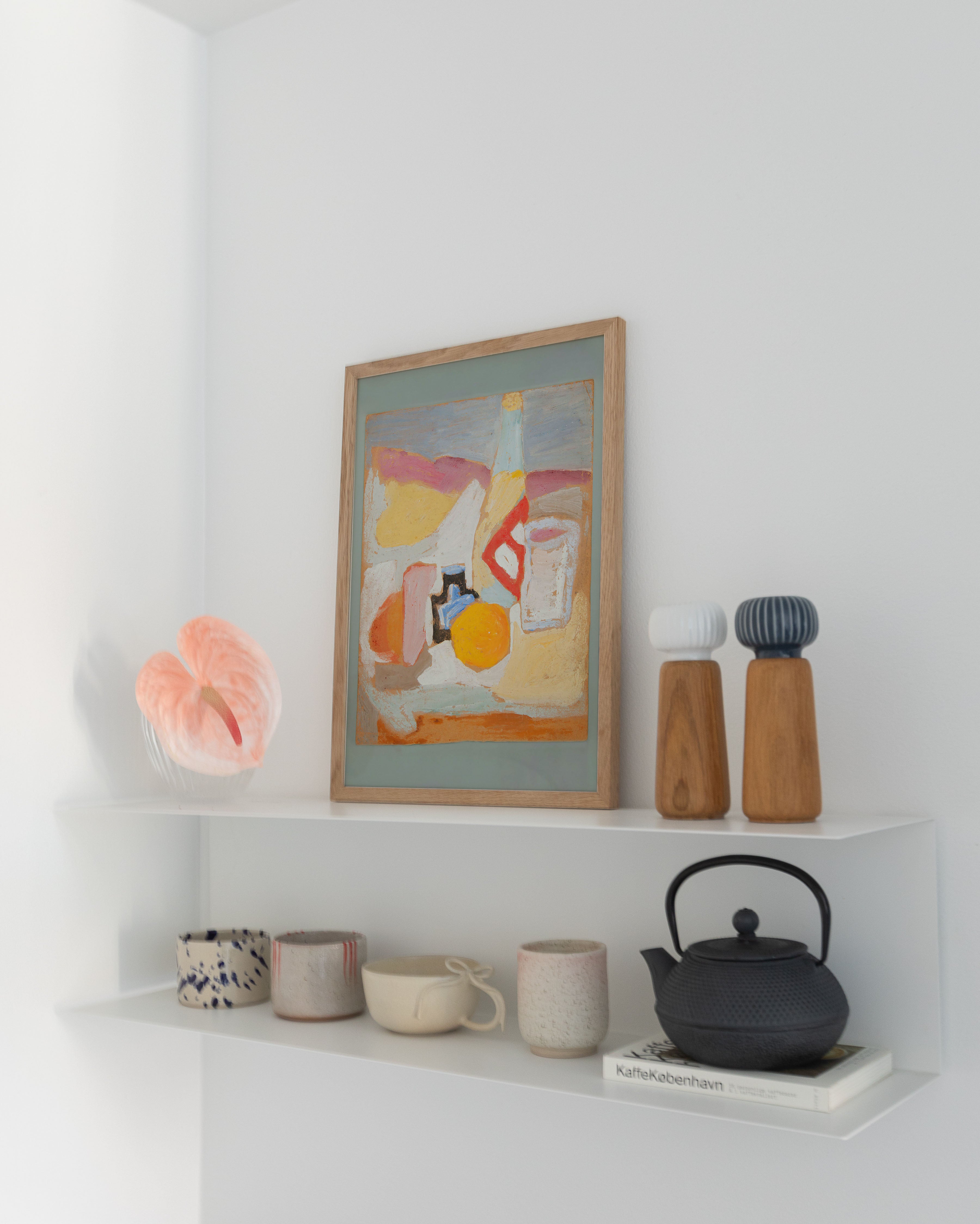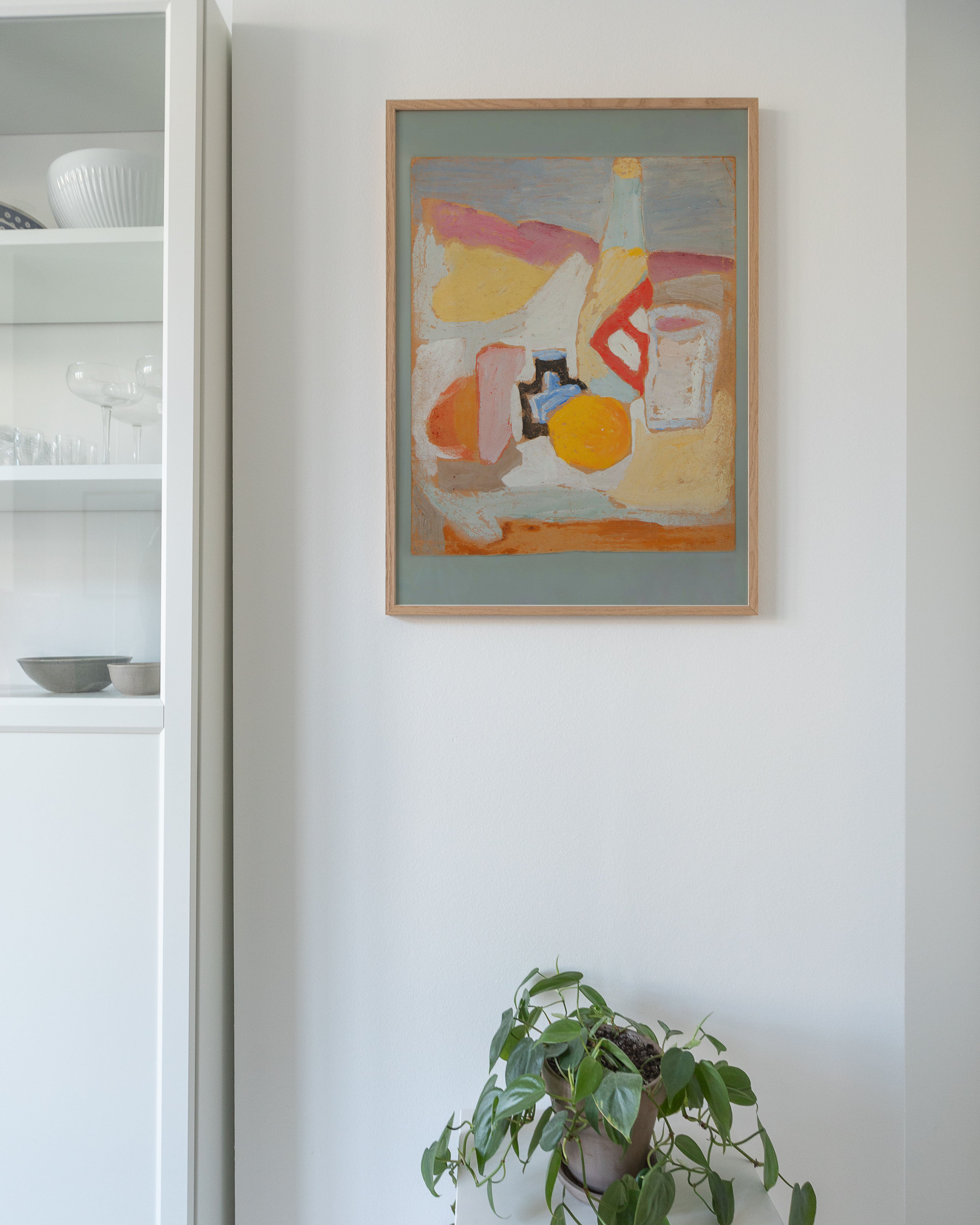 "Still life with orange, bottle and inkwell" - Oplev en farverig og unik plakat, der fanger essensen af stillebenkunst. Med levende nuancer af orange, blå og rosa, bringer denne plakat liv til ethvert rum. Perfekt til kunstelskere, der søger noget særligt og iøjnefaldende.