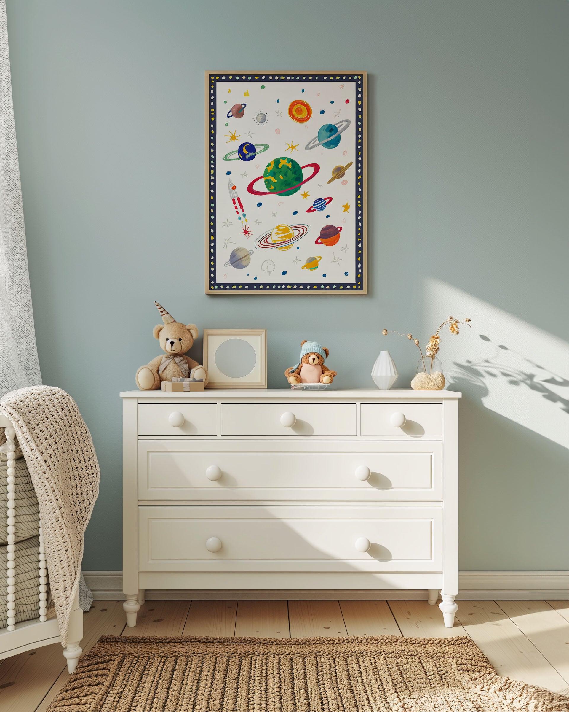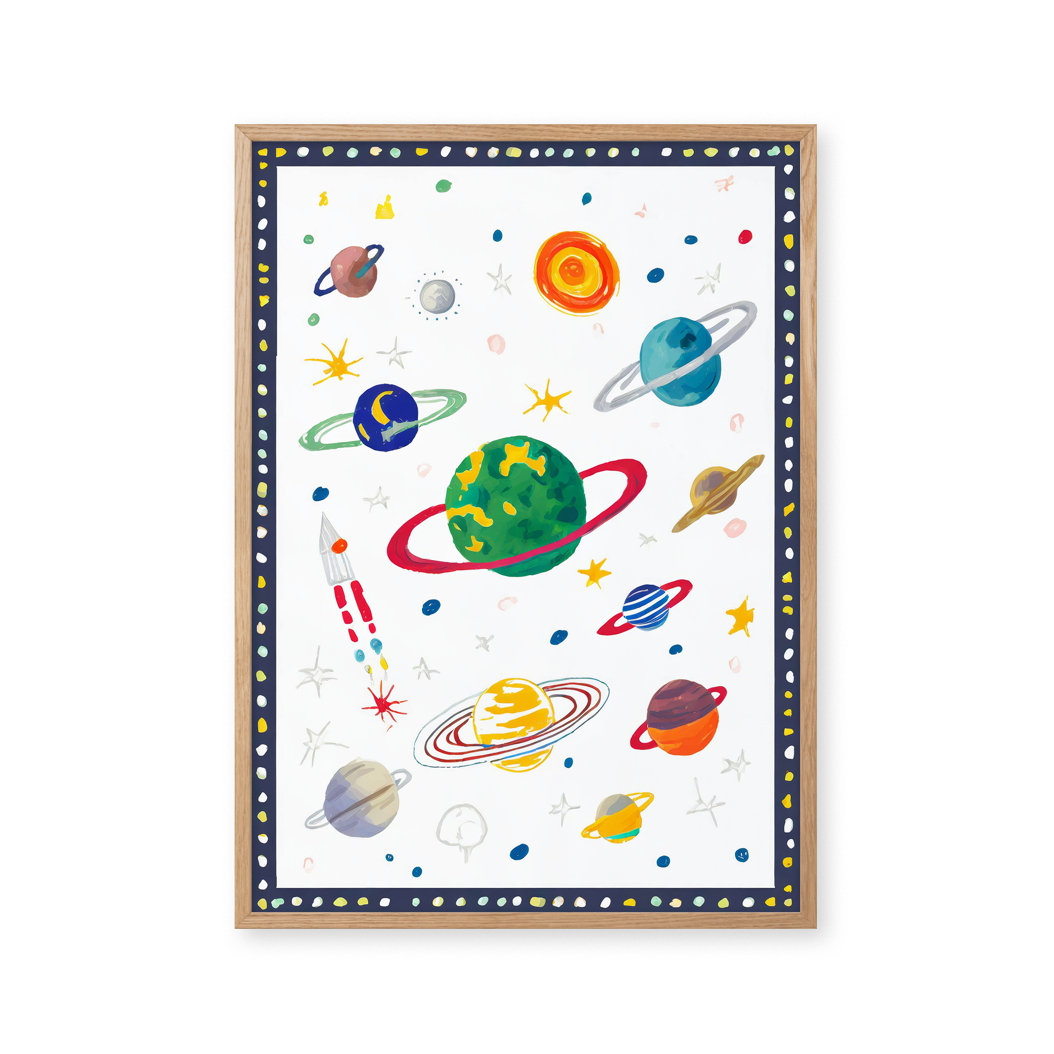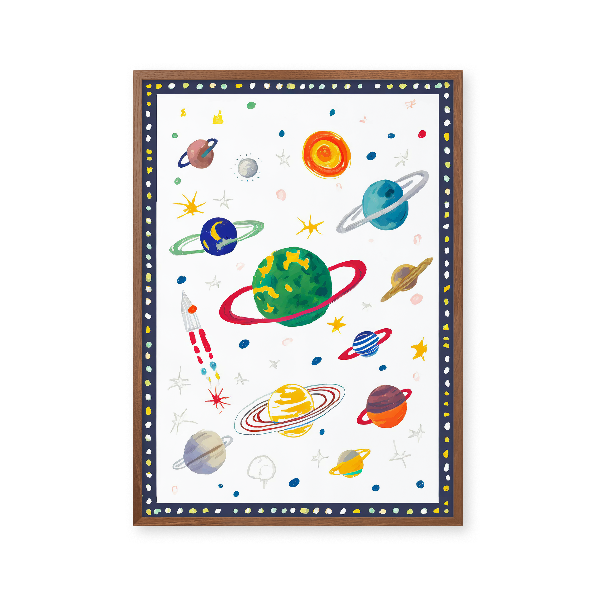 "Stjernernes dans om solen" plakat: En kosmisk symfoni i levende farver. Denne vægkunst fanger blikket med sit livlige design af planeter og stjerner, perfekt til at inspirere rumentusiaster og tilføje et stjernestøv til enhver indretning. Ideal til børneværelset eller den moderne stue.