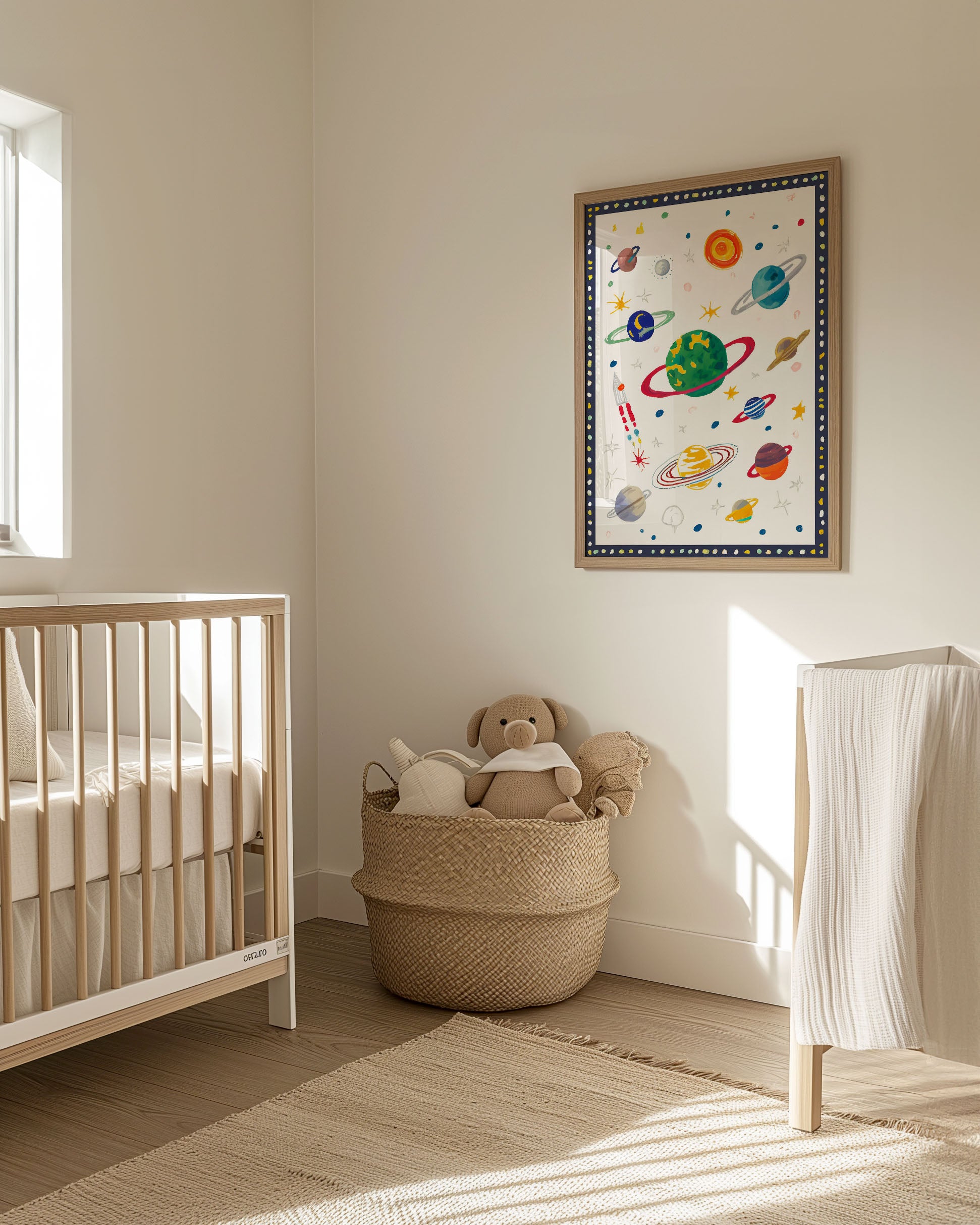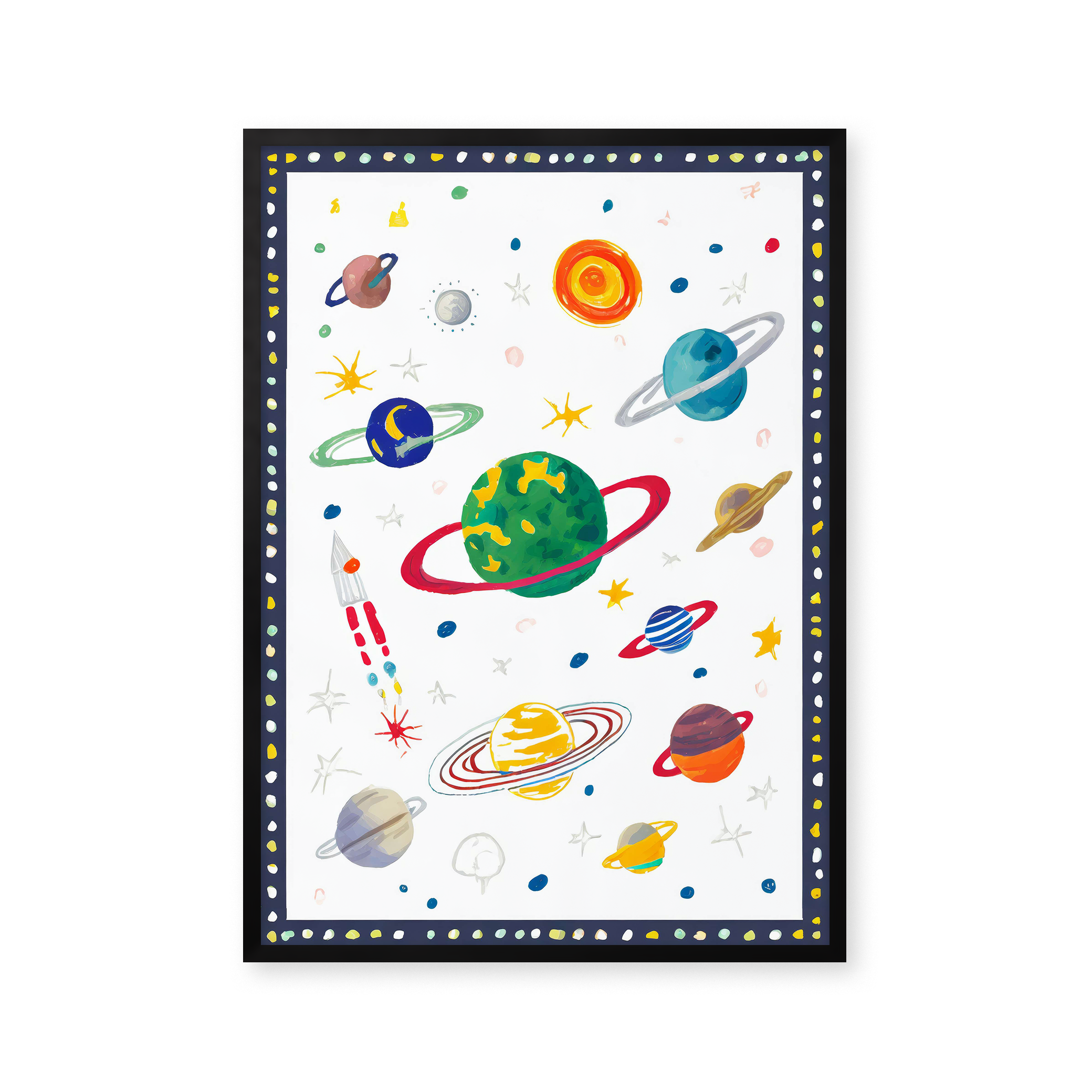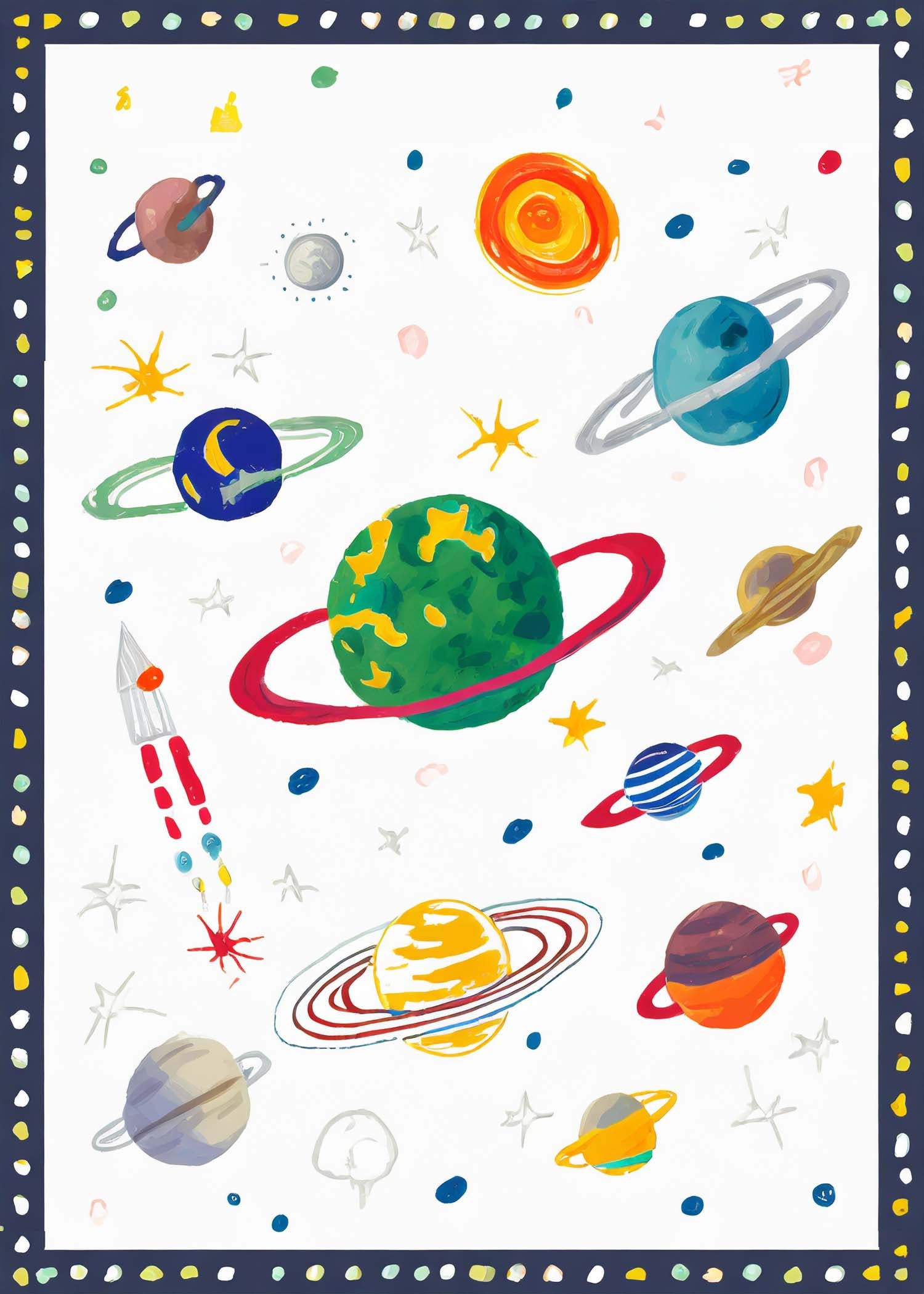 "Stjernernes dans om solen" plakat: En kosmisk symfoni i levende farver. Denne vægkunst fanger blikket med sit livlige design af planeter og stjerner, perfekt til at inspirere rumentusiaster og tilføje et stjernestøv til enhver indretning. Ideal til børneværelset eller den moderne stue.