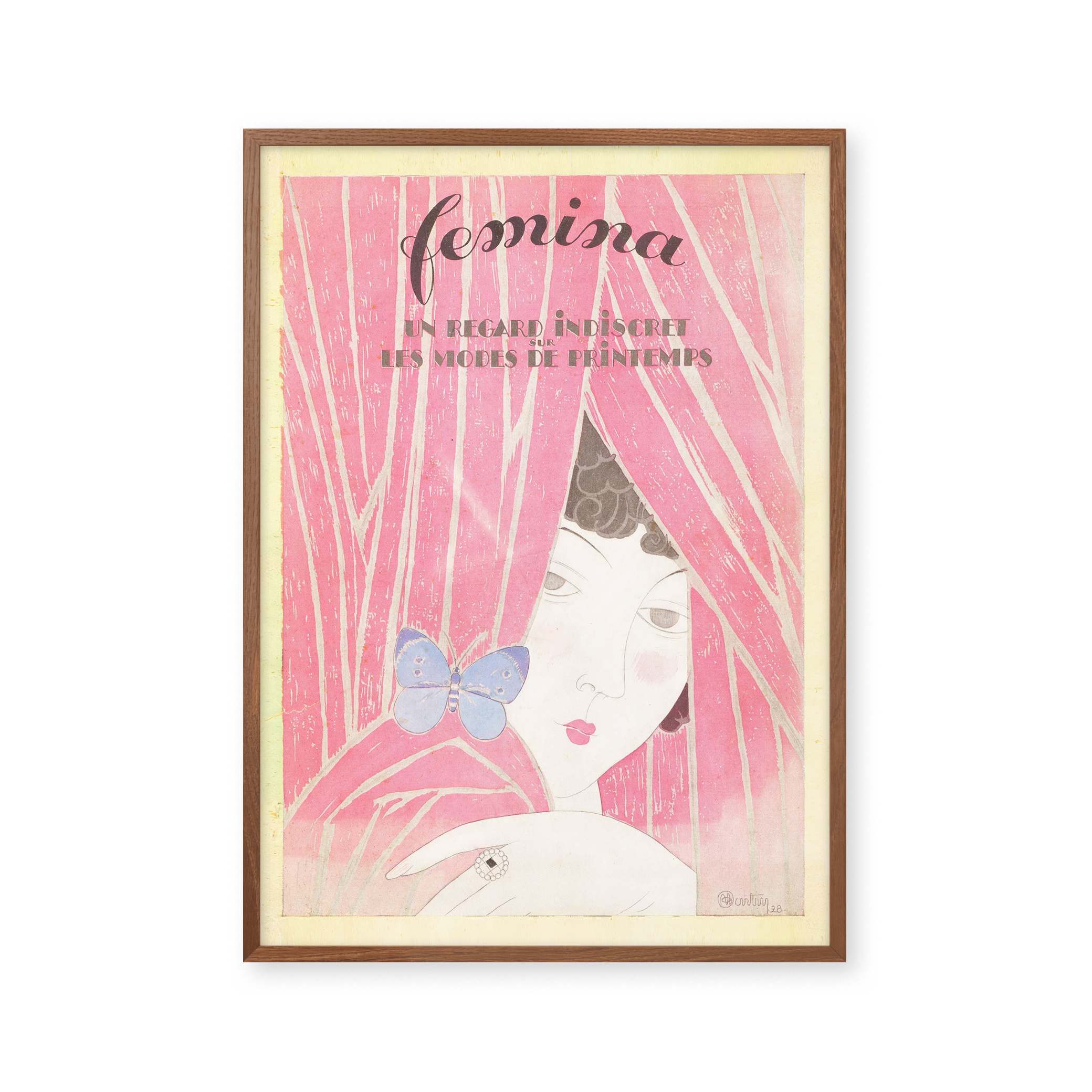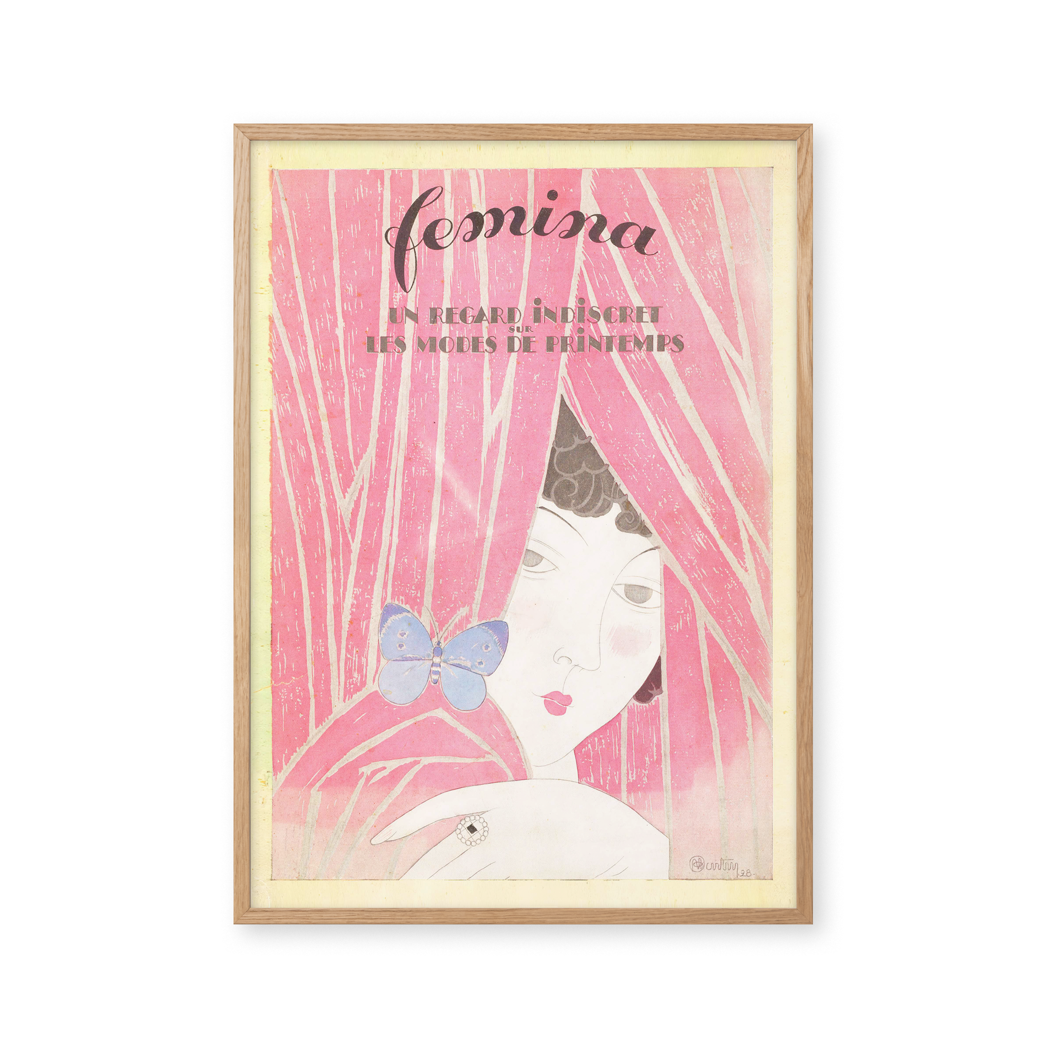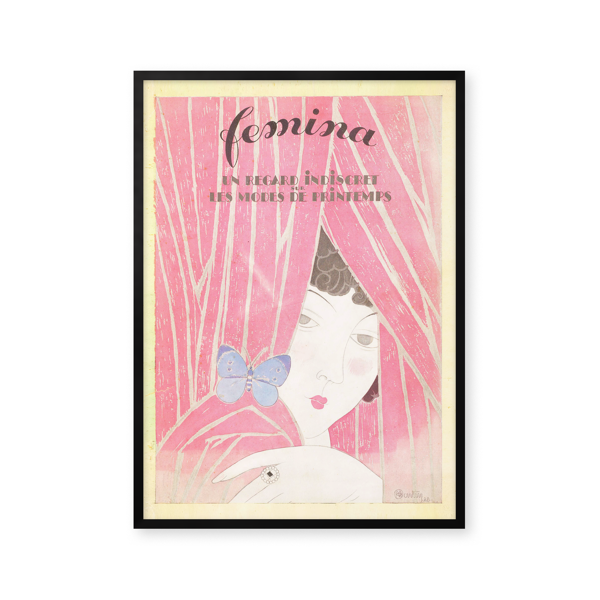 "The Fashion Magazine as Temptress" plakat: En fortryllende blanding af lyserøde nuancer og delikate detaljer. Denne unikke kunstplakat fanger essensen af forårsmode med en mystisk kvinde og en blå sommerfugl. Perfekt til at tilføje et strejf af elegance og farve til dit hjem.