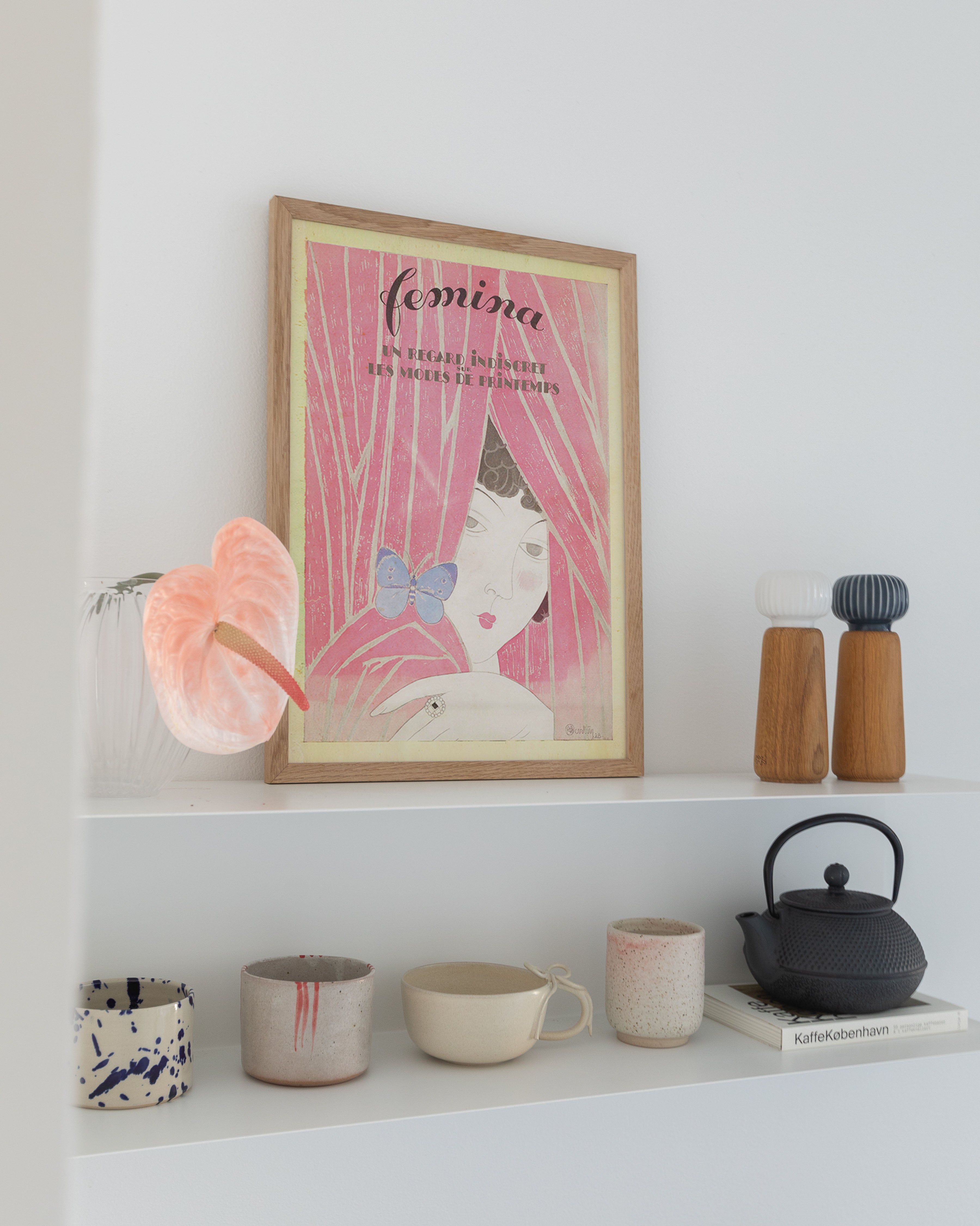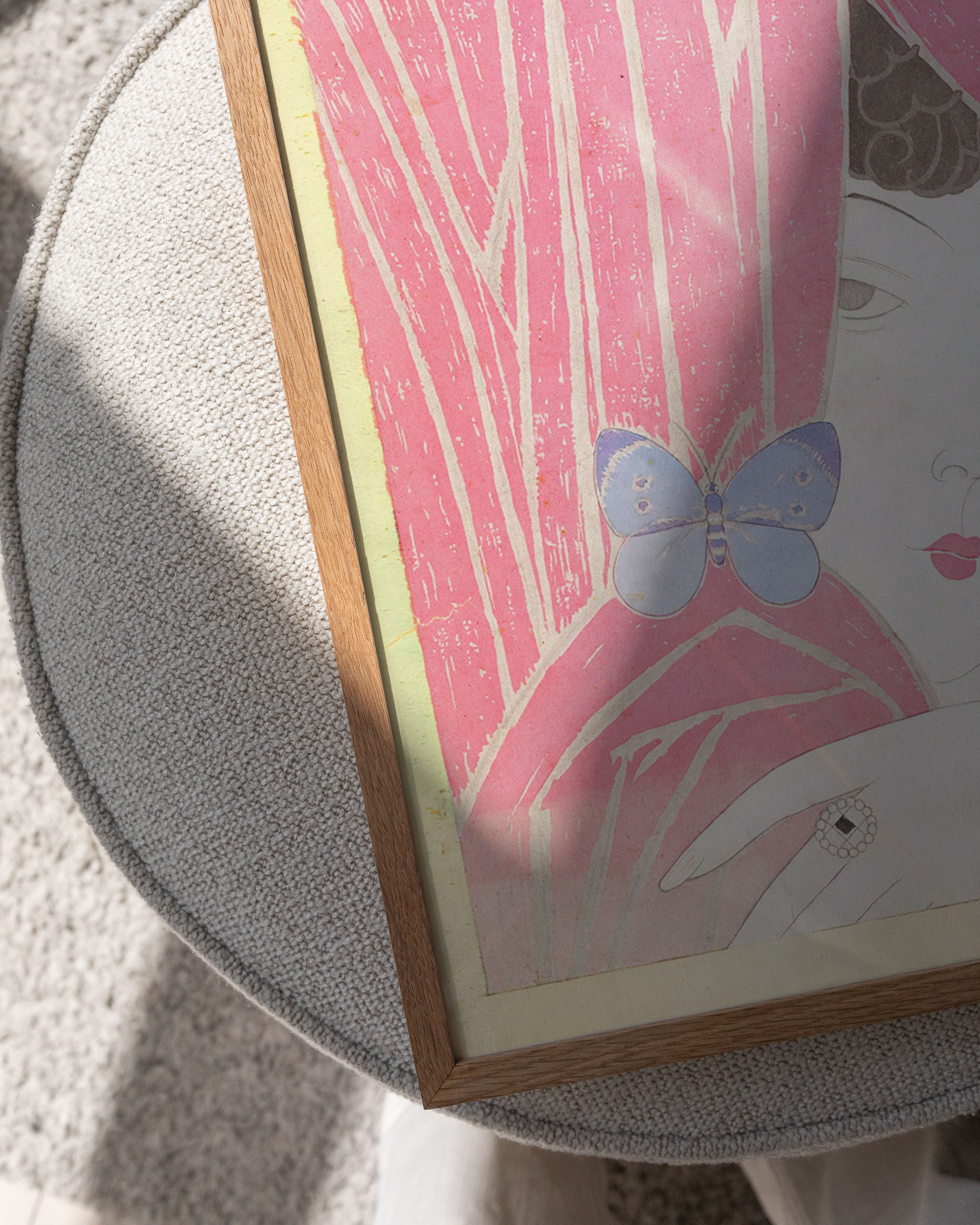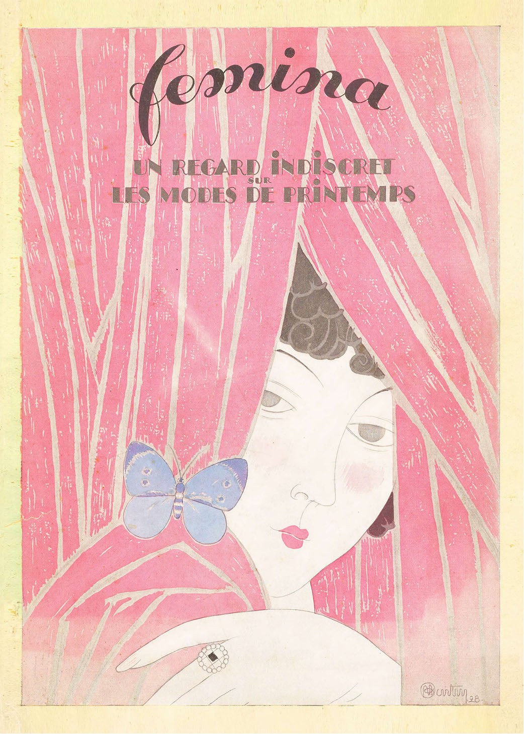 "The Fashion Magazine as Temptress" plakat: En fortryllende blanding af lyserøde nuancer og delikate detaljer. Denne unikke kunstplakat fanger essensen af forårsmode med en mystisk kvinde og en blå sommerfugl. Perfekt til at tilføje et strejf af elegance og farve til dit hjem.