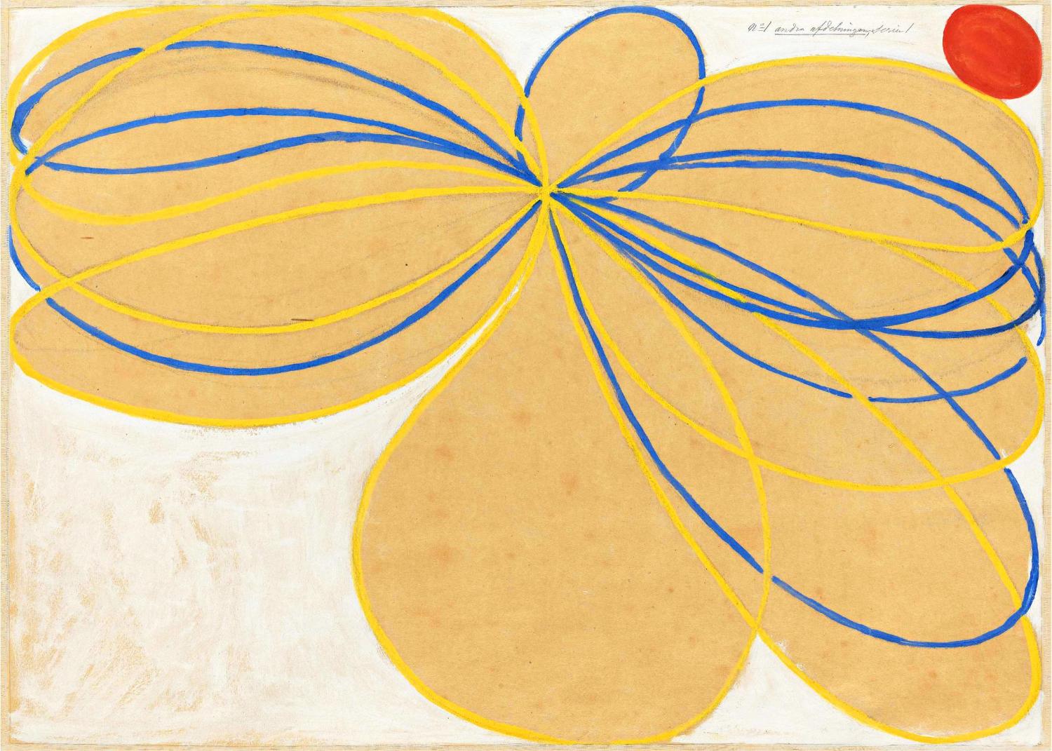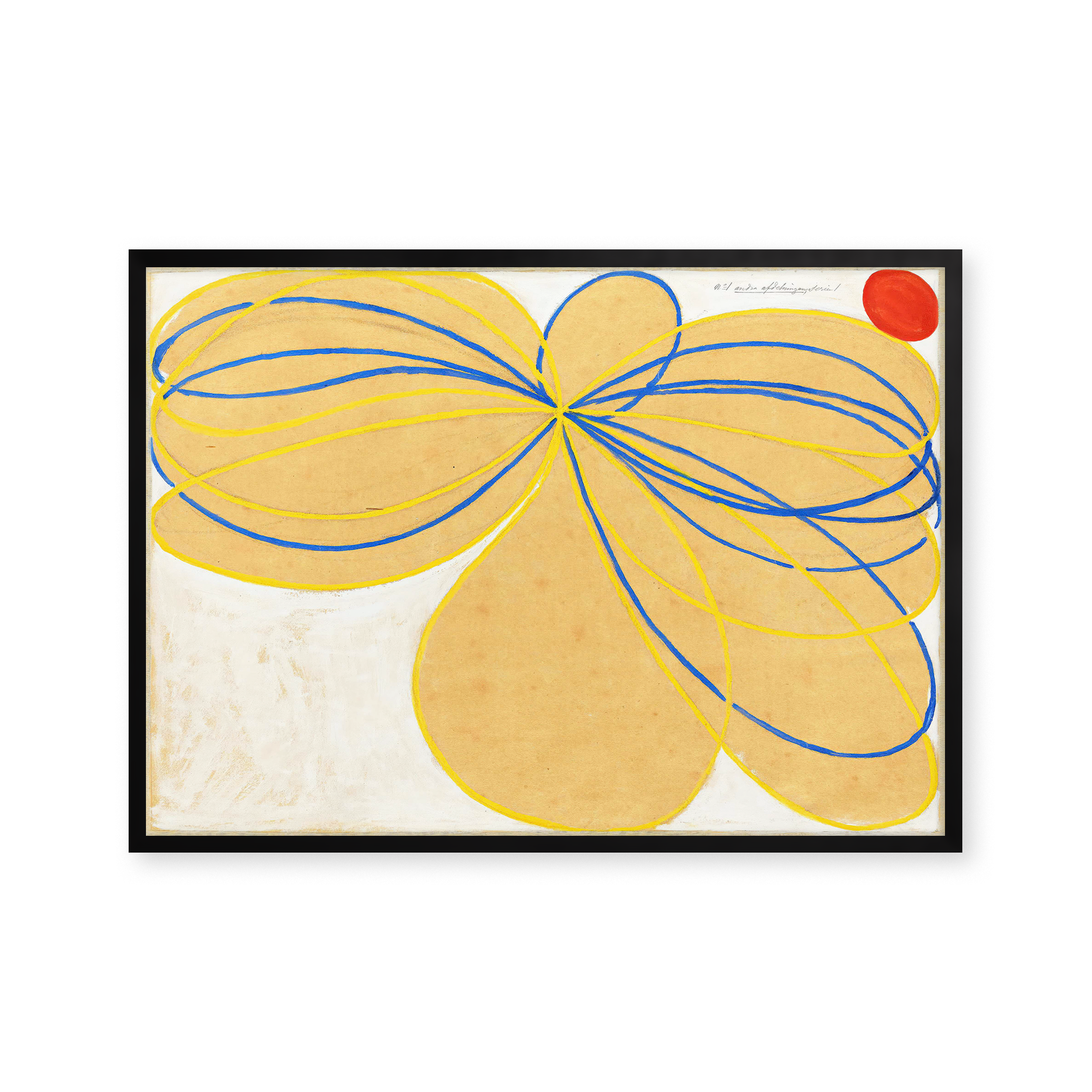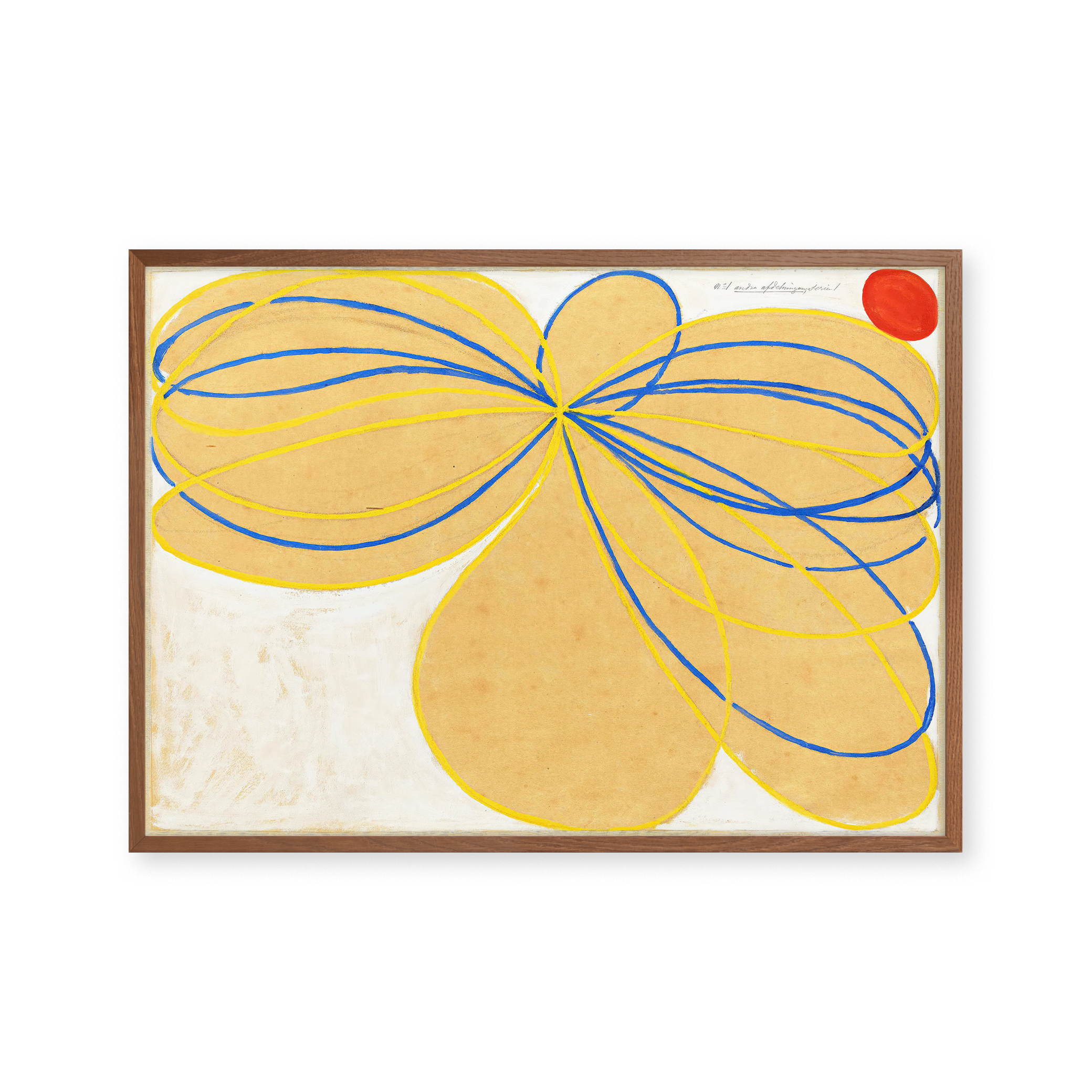 "The Seven-Pointed Star No. 1" plakat præsenterer en hypnotiserende symfoni af blå og gule linjer på en varm beige baggrund, med en iøjnefaldende rød cirkel. Perfekt til at tilføje farve og unikke elementer til ethvert rum.