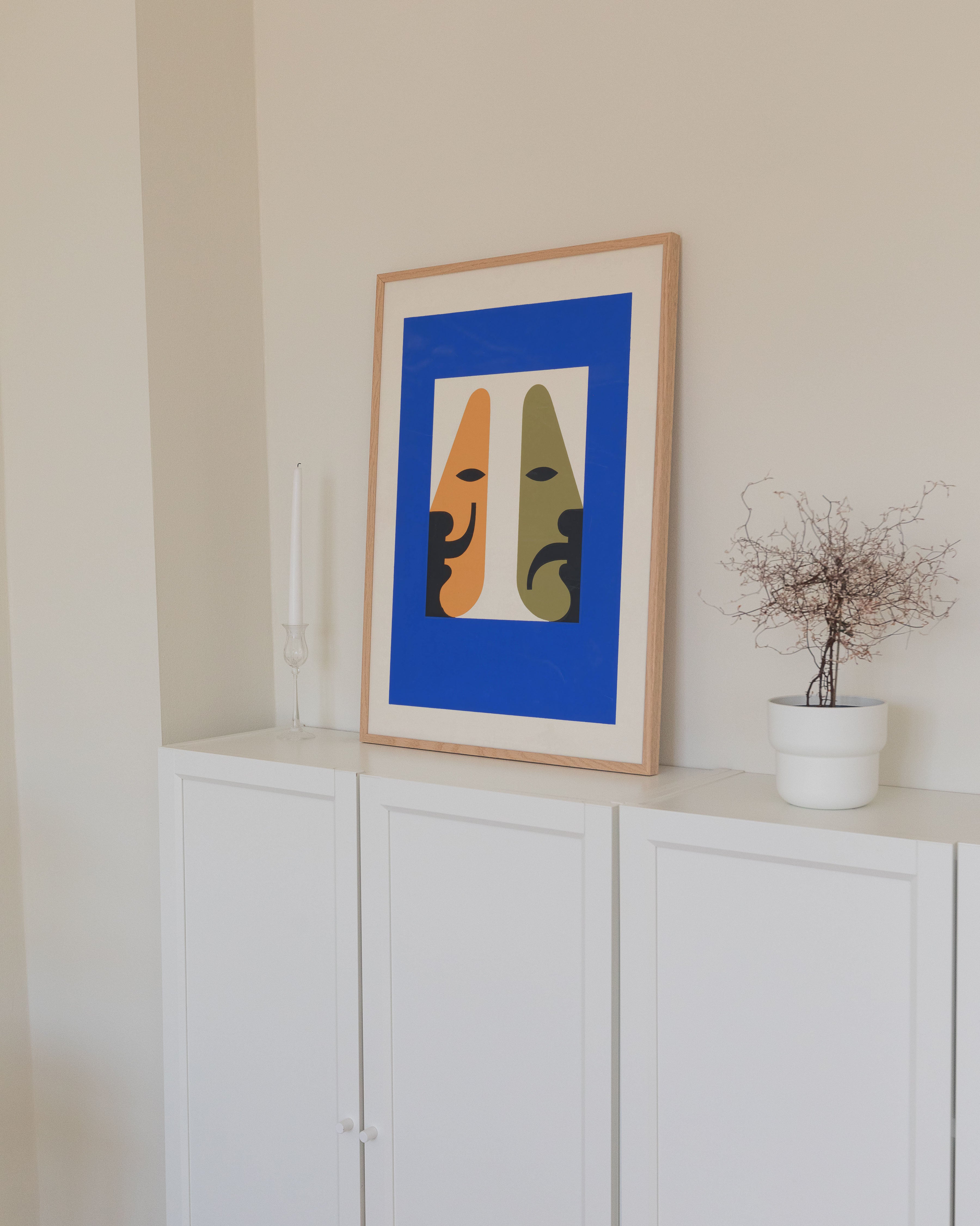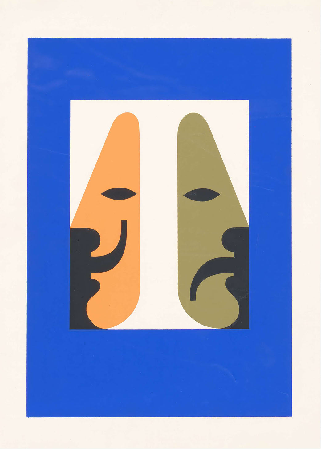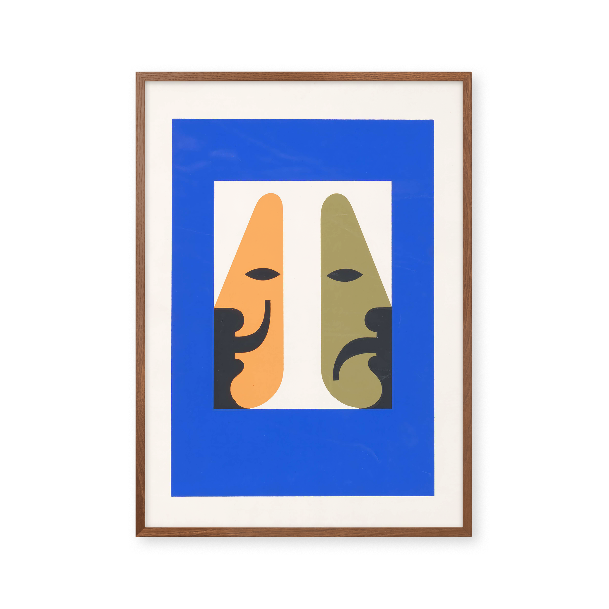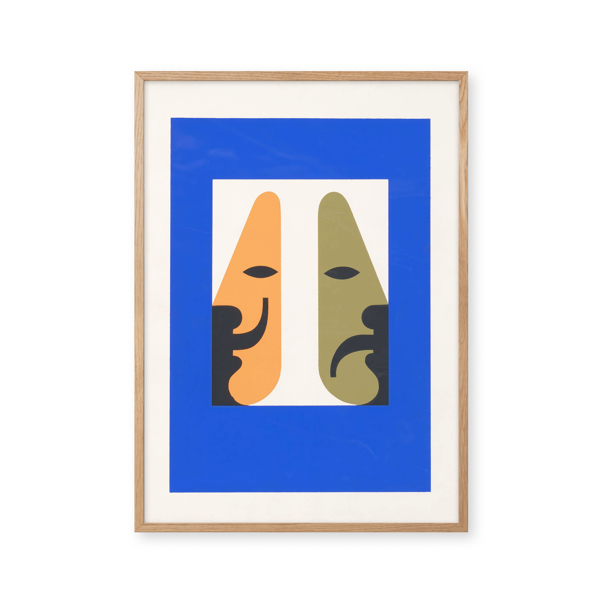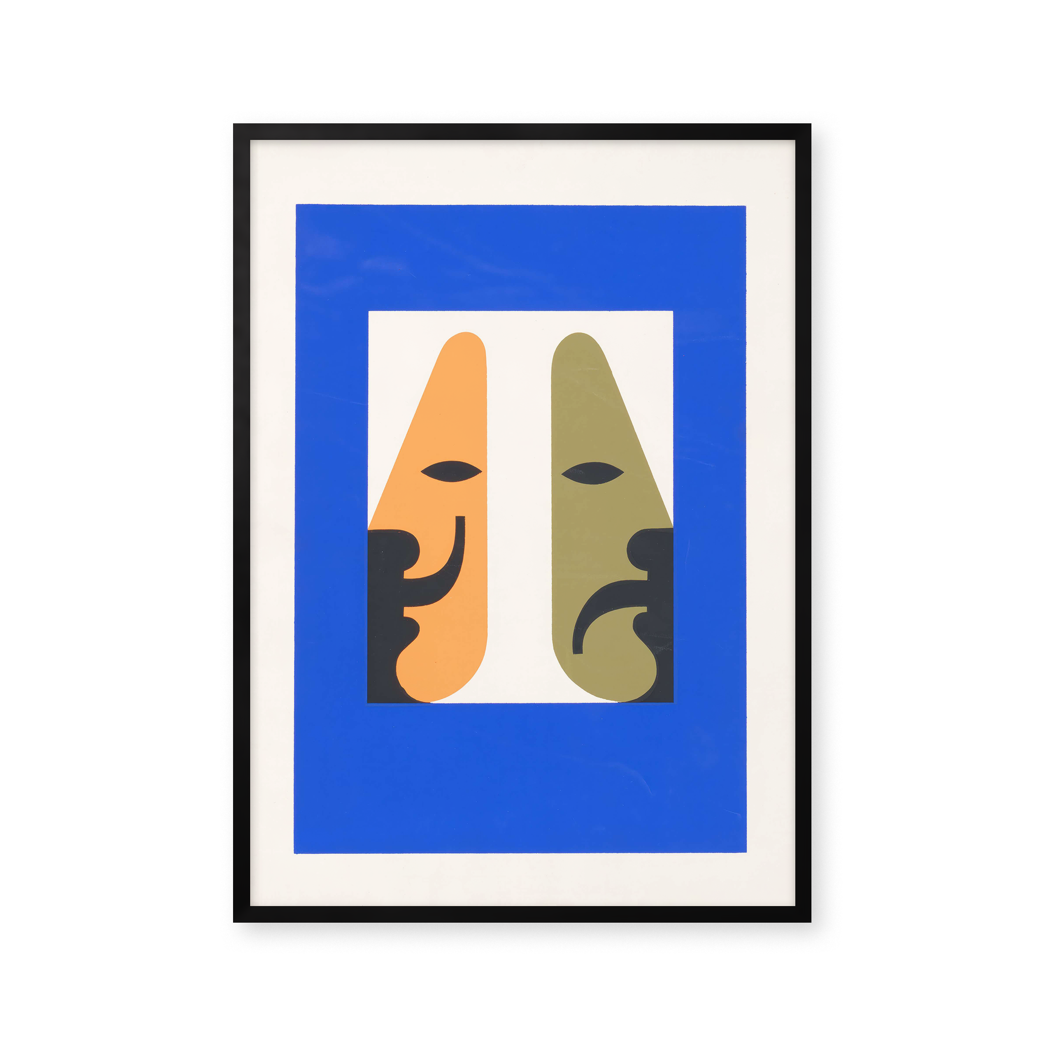 "The Spirit of the Living Theatre" plakat fanger teatrets essens med levende farver og unikke former. Dens dristige blå ramme og kontrasterende ansigter i orange og grøn skaber en dynamisk visuel oplevelse, perfekt til at bringe kunst og drama ind i ethvert rum.