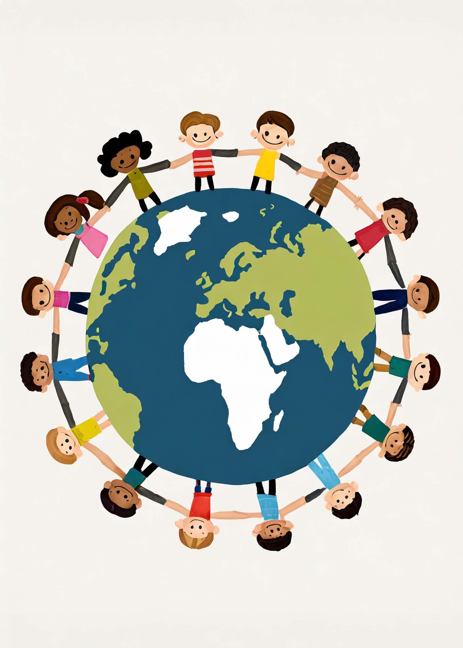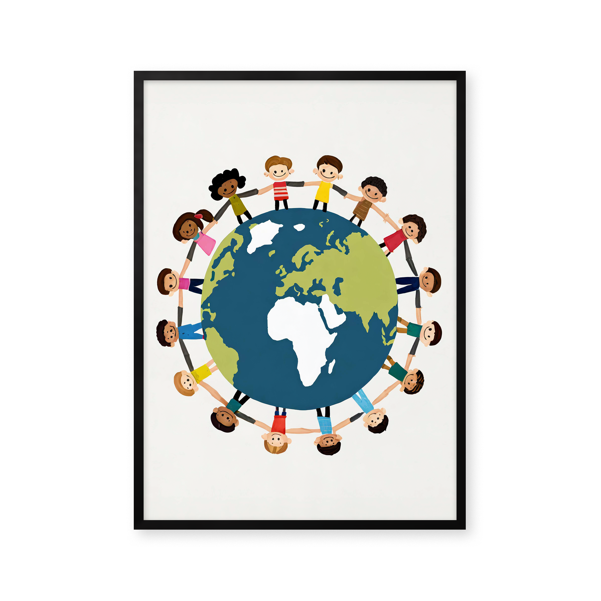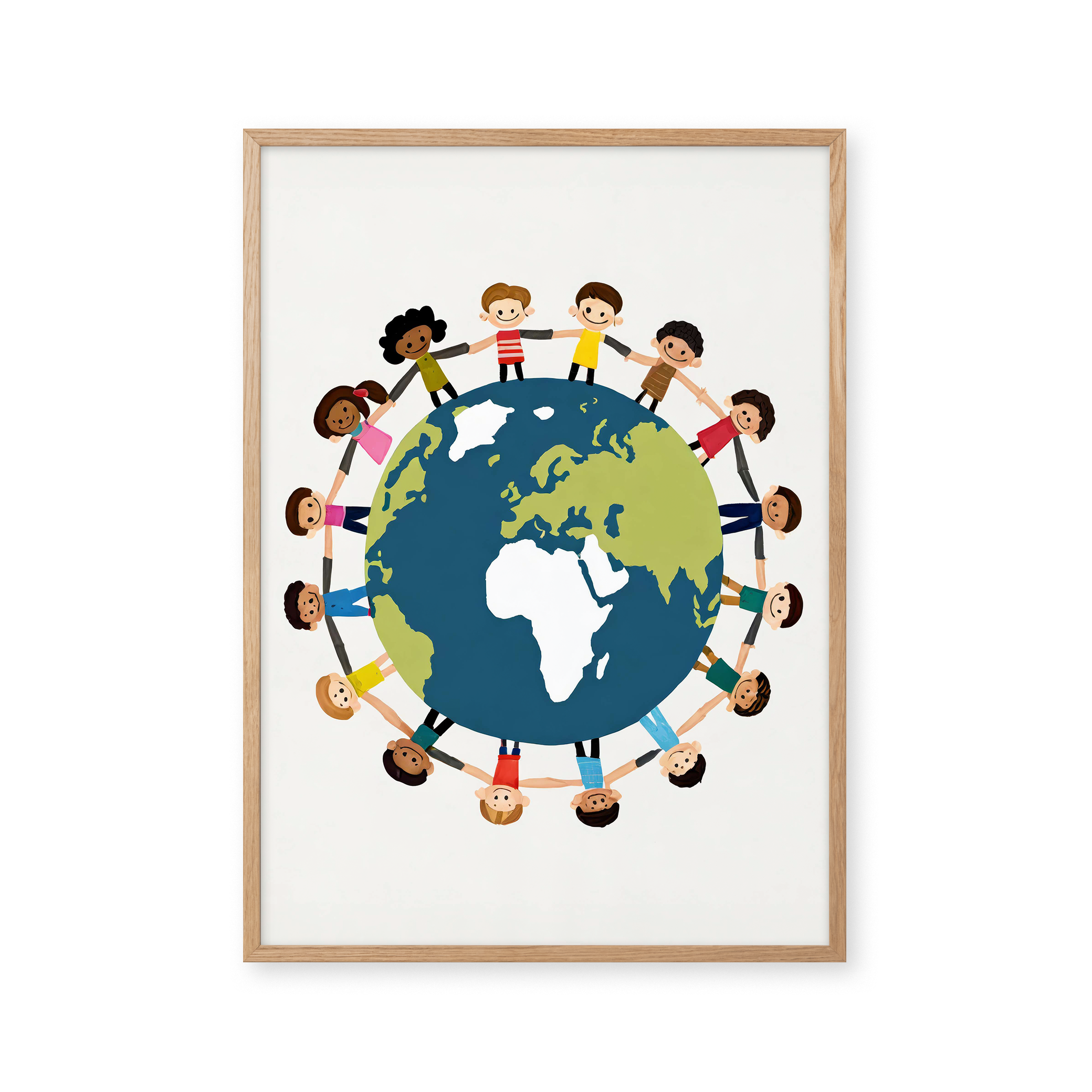 Oplev 'Verdensomspændende Venskab' gennem denne livlige plakat, hvor forskelligartede børn holder hænder omkring en detaljeret jordklode. De varme farver og glade ansigter fremhæver enhed og global harmoni. Perfekt til klasseværelser og børneværelser, der værdsætter kulturel mangfoldighed.