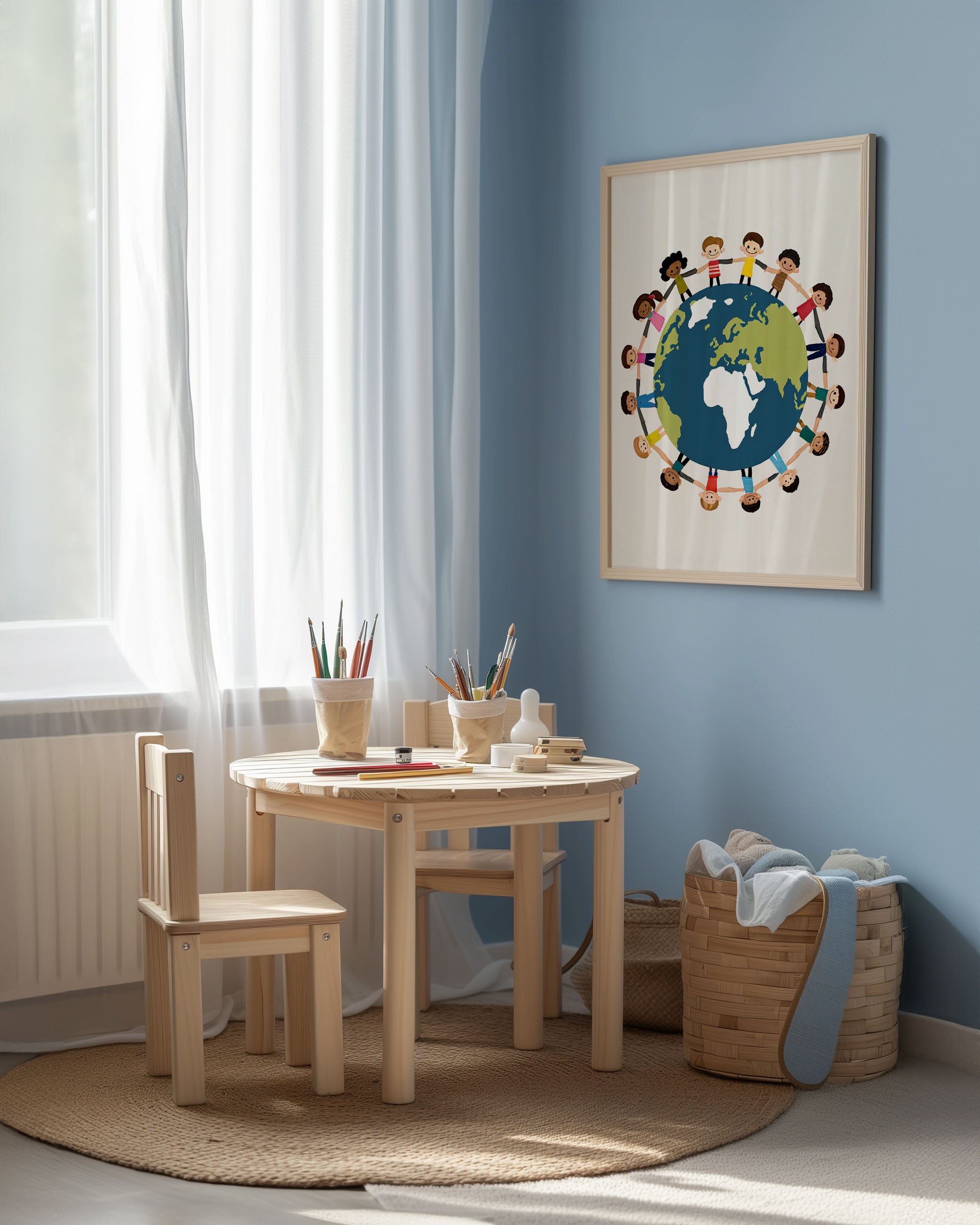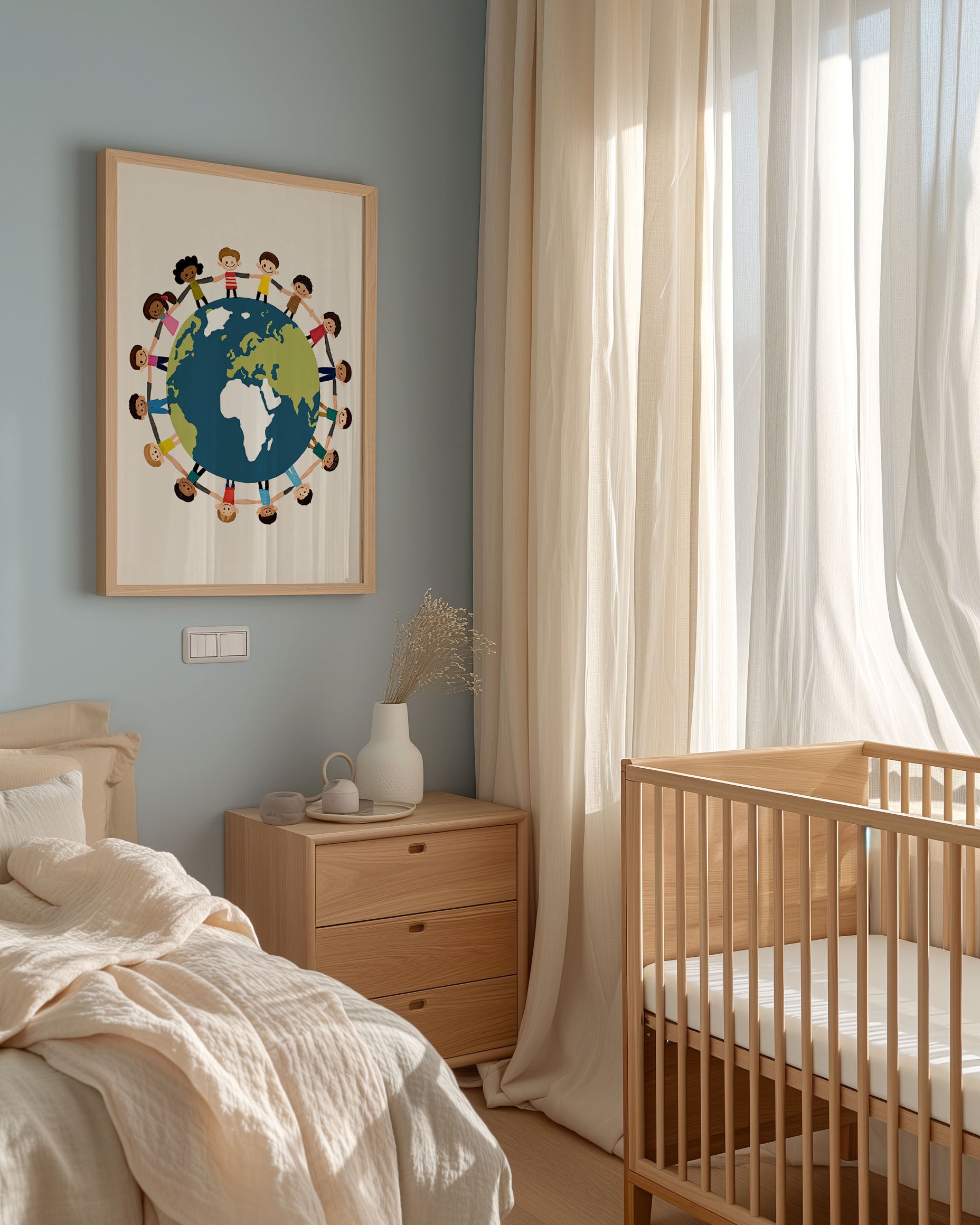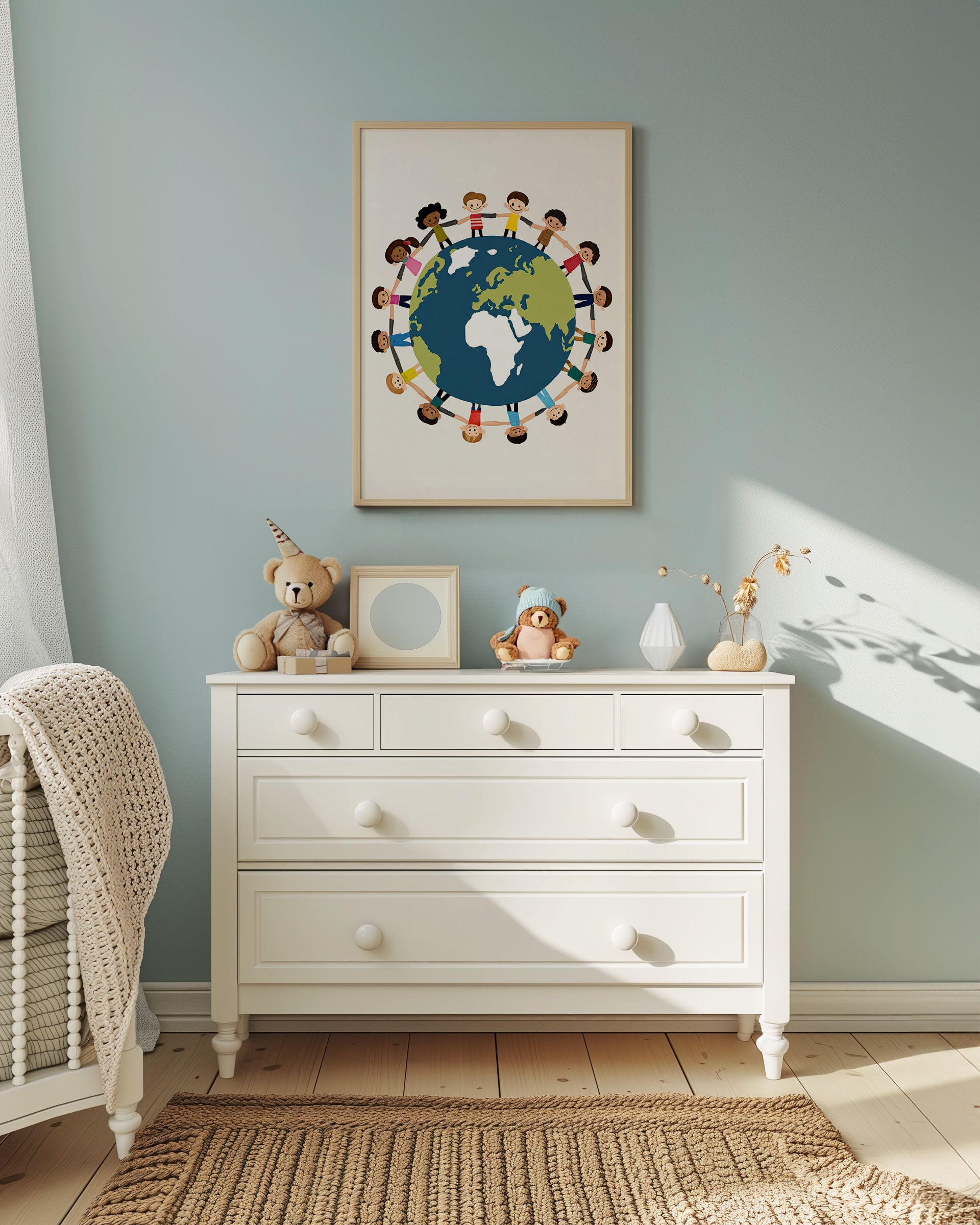 Oplev 'Verdensomspændende Venskab' gennem denne livlige plakat, hvor forskelligartede børn holder hænder omkring en detaljeret jordklode. De varme farver og glade ansigter fremhæver enhed og global harmoni. Perfekt til klasseværelser og børneværelser, der værdsætter kulturel mangfoldighed.