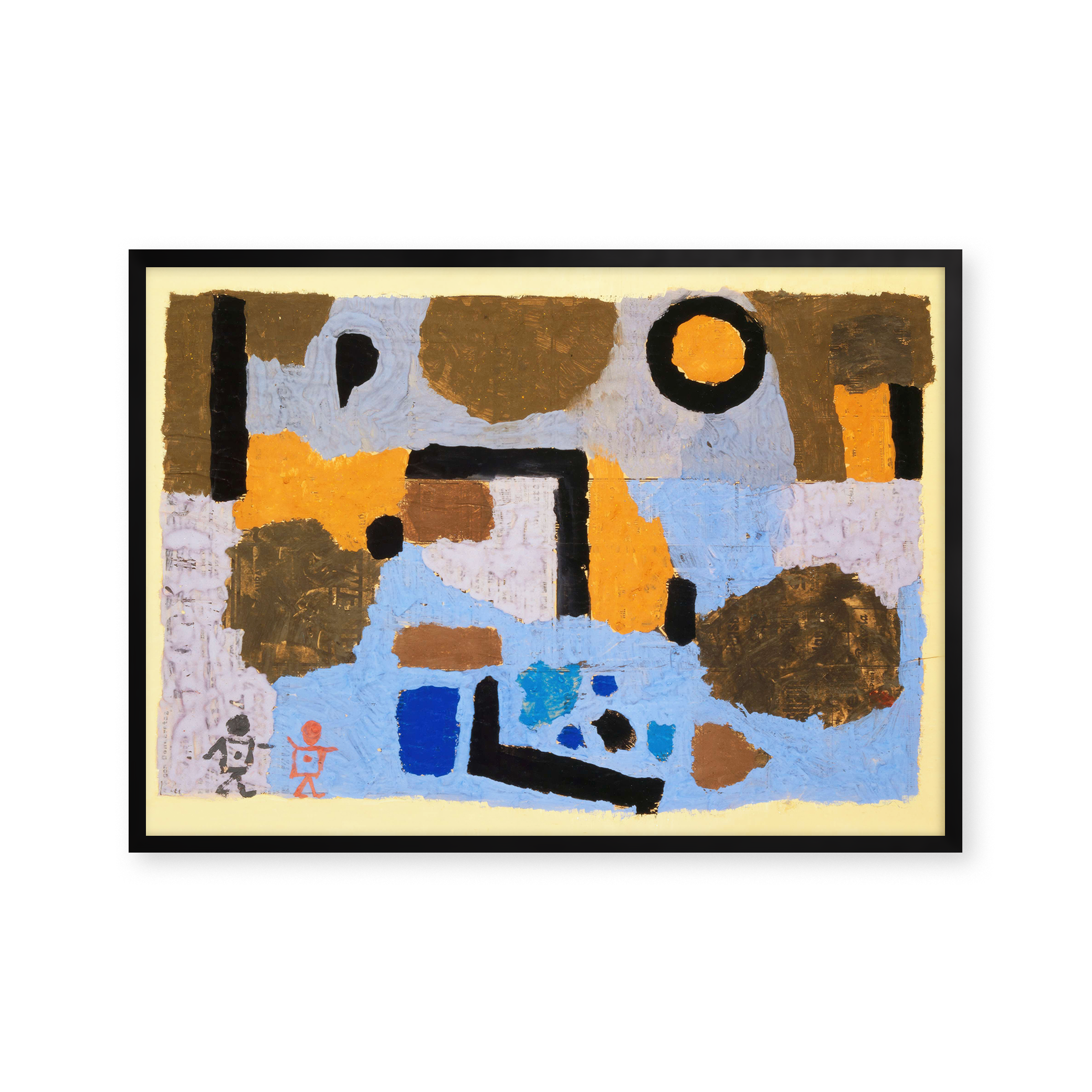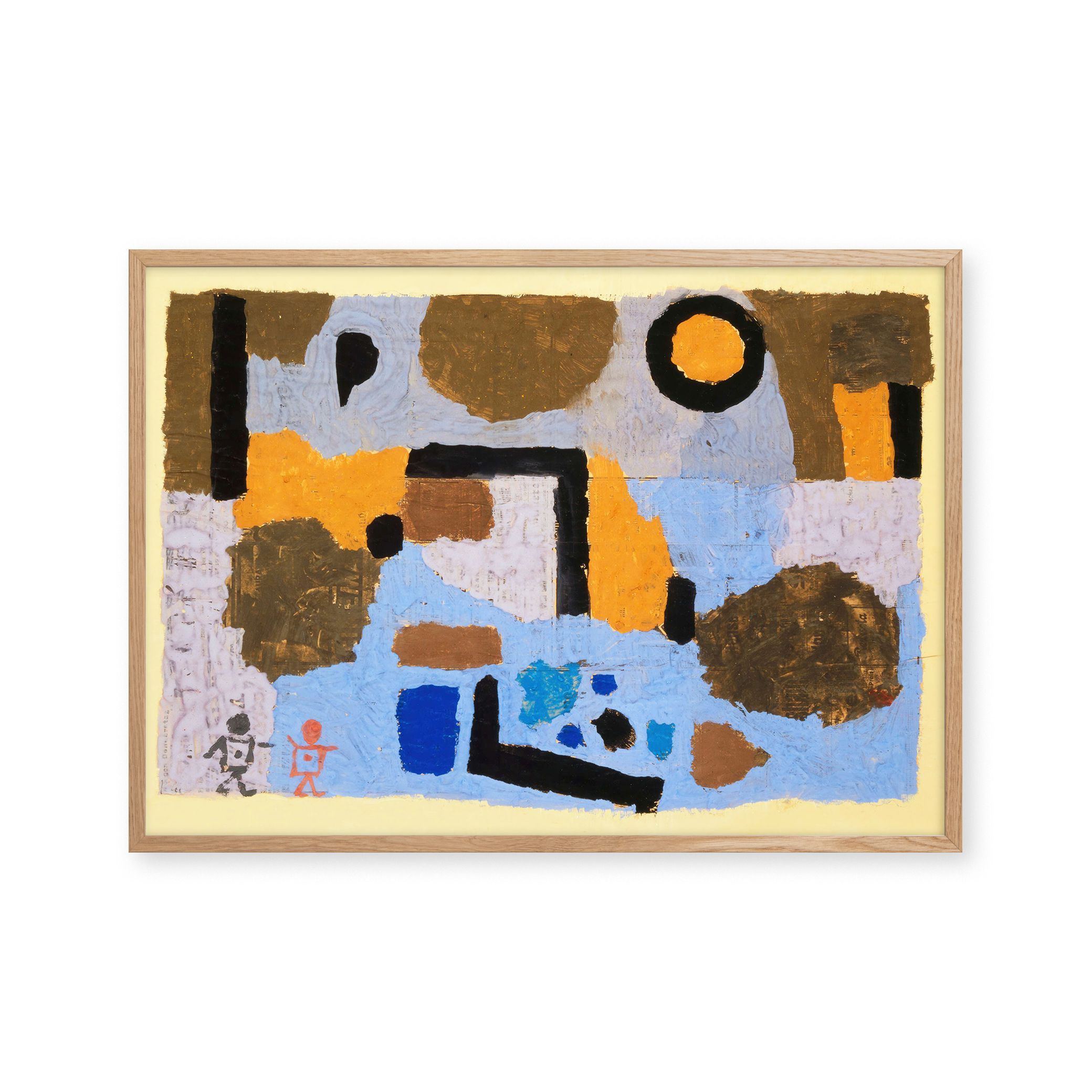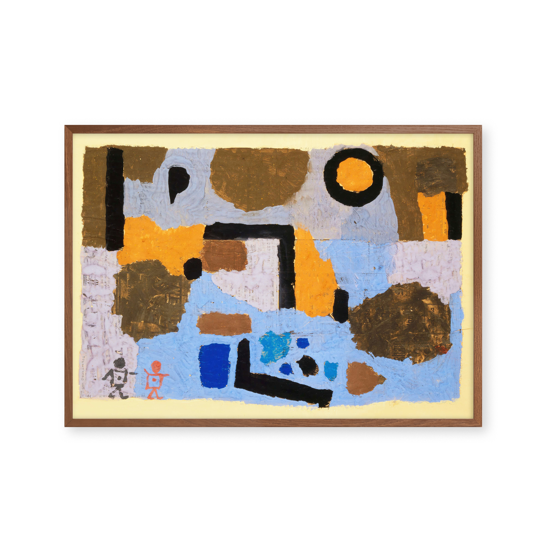 "With the two lost ones" - Oplev en farverig og abstrakt plakat, der kombinerer blå, orange og guld nuancer. Unikke figurer og geometriske former skaber en dynamisk og fængslende visuel oplevelse. Perfekt til at tilføje kunstnerisk flair til ethvert rum.