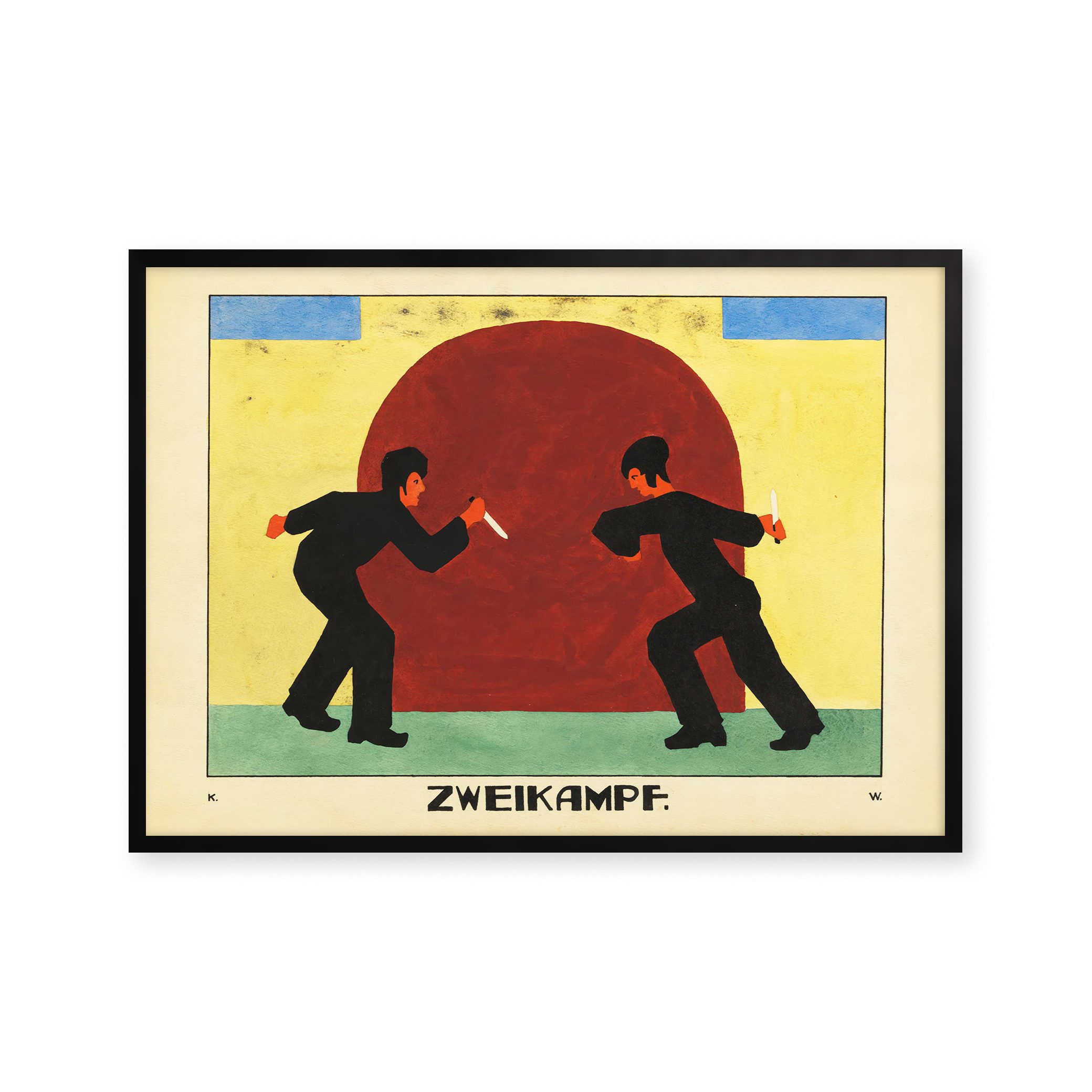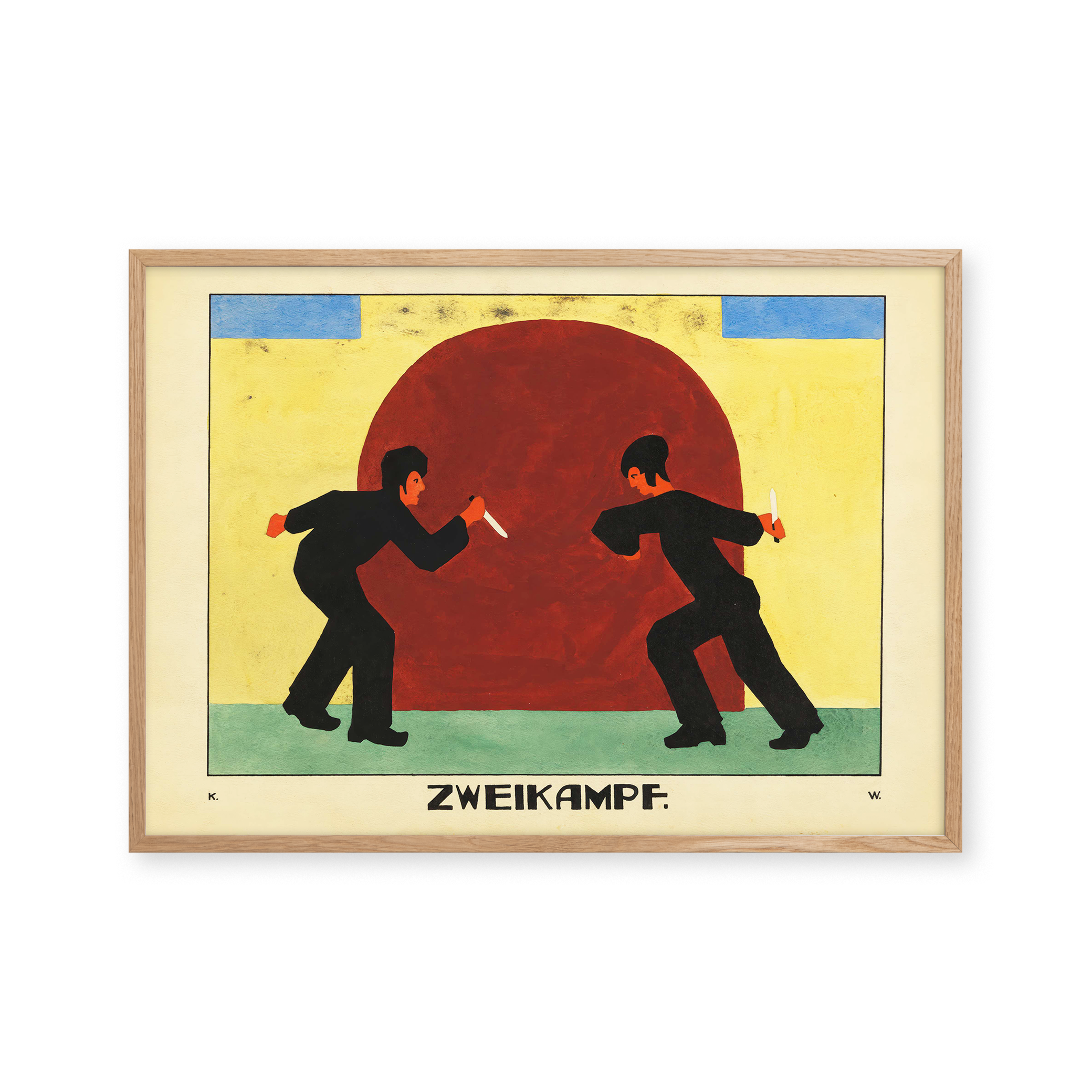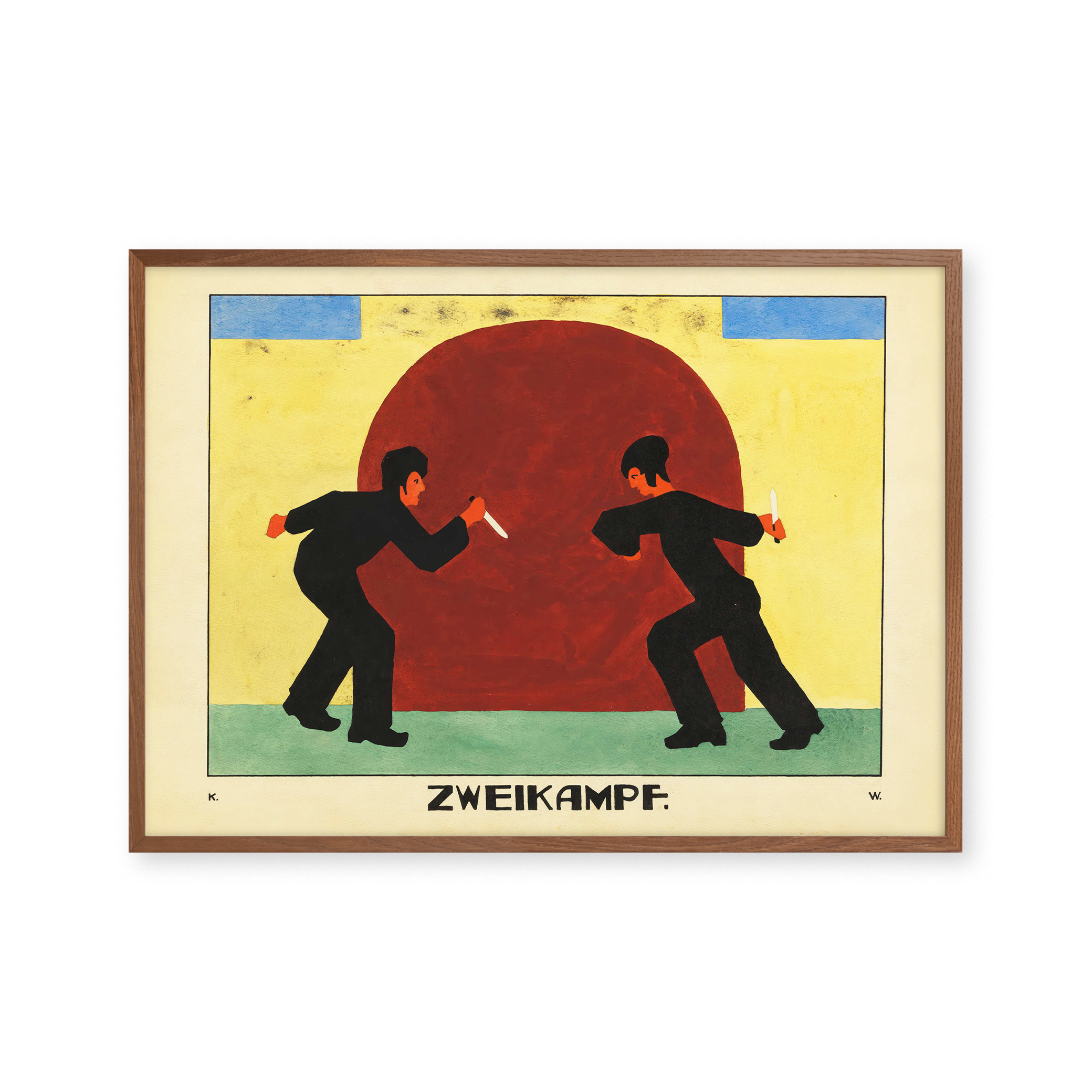 "Zweikampf" plakat: Oplev intensiteten i denne farverige kunstplakat, der fanger en dramatisk duel. Med dybe røde, blå og gule nuancer bringer den unikke komposition energi og spænding til ethvert rum. Perfekt til kunstelskere, der søger et iøjnefaldende og dynamisk stykke.