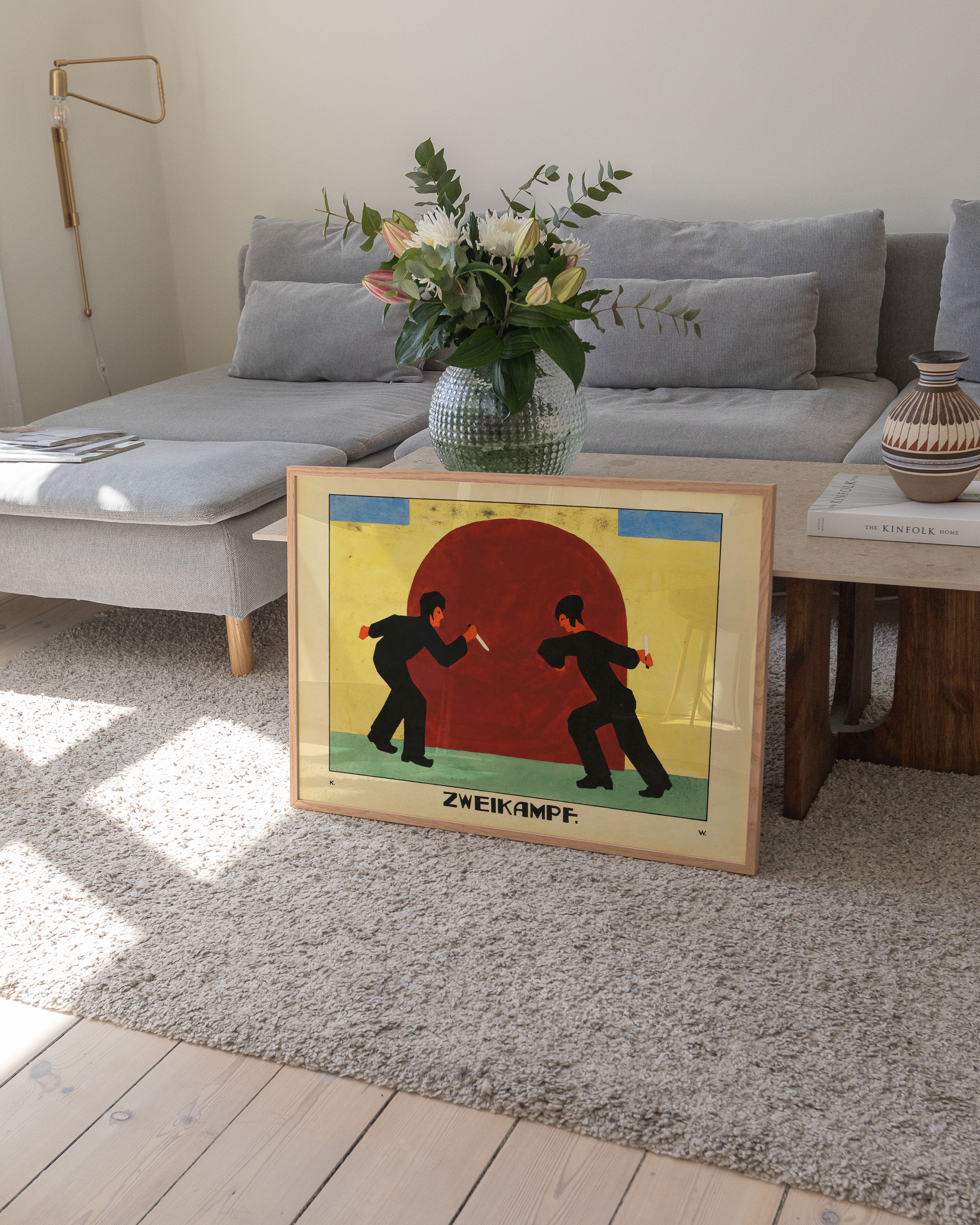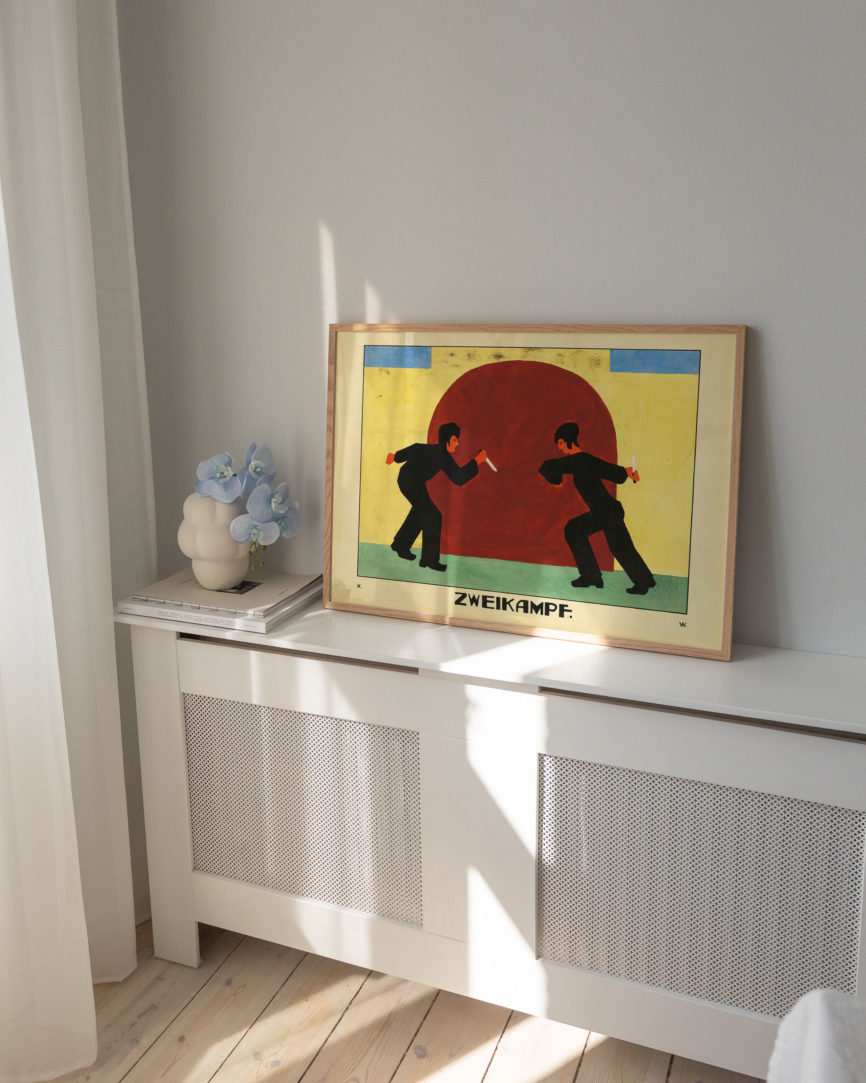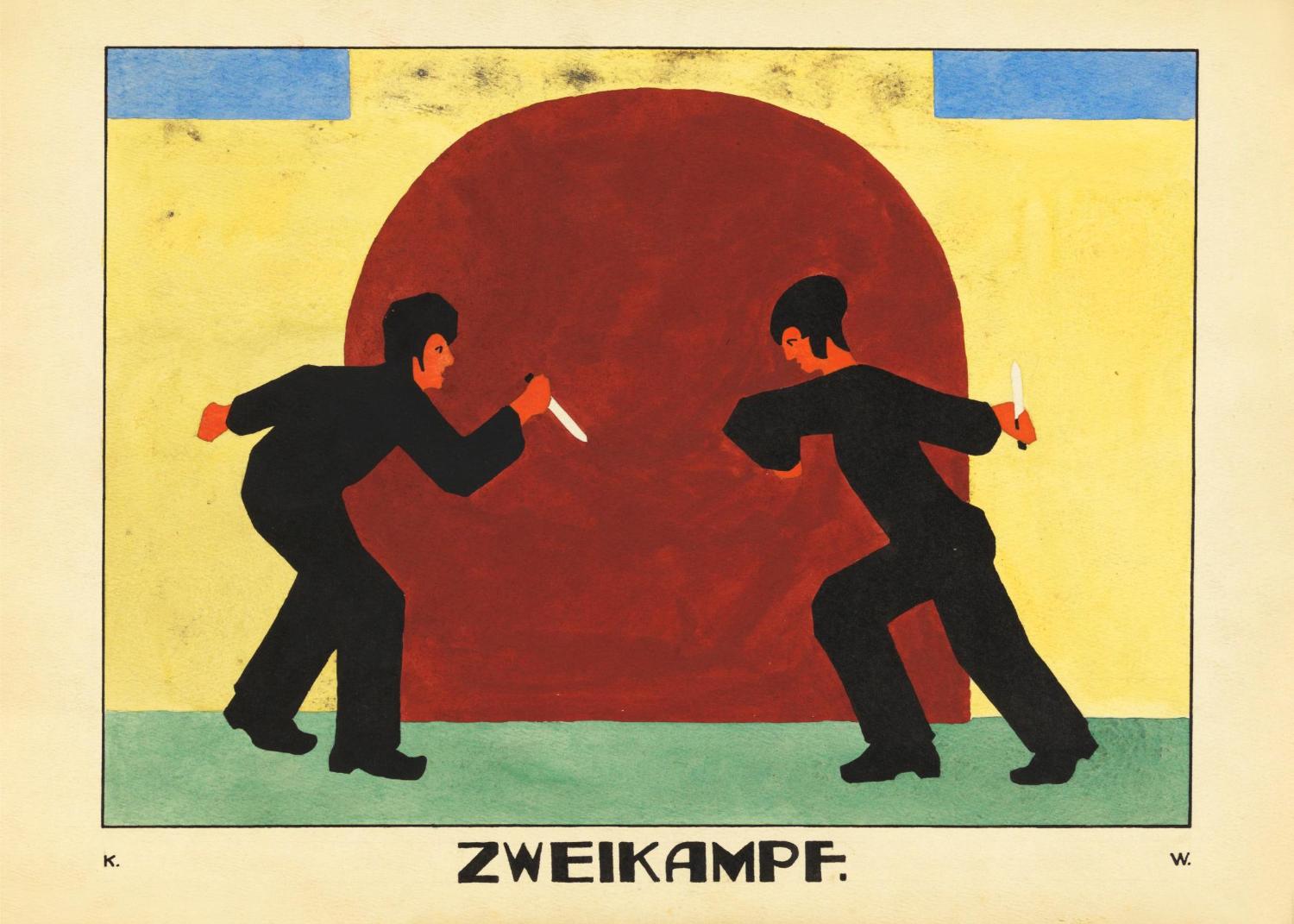 "Zweikampf" plakat: Oplev intensiteten i denne farverige kunstplakat, der fanger en dramatisk duel. Med dybe røde, blå og gule nuancer bringer den unikke komposition energi og spænding til ethvert rum. Perfekt til kunstelskere, der søger et iøjnefaldende og dynamisk stykke.